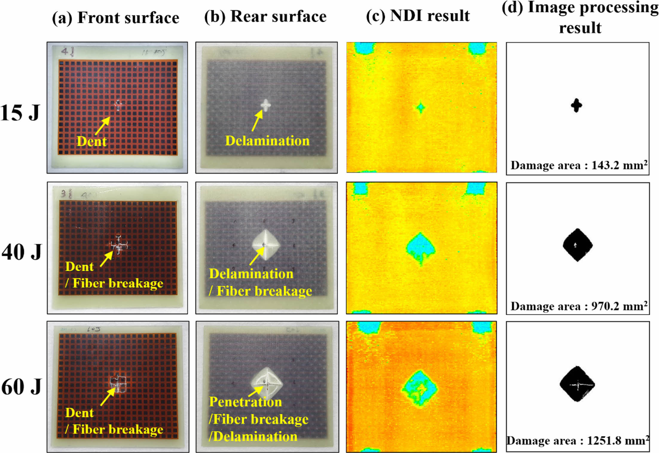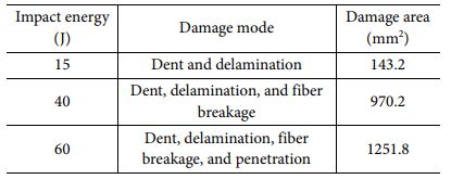 손상 모드에 따른 주기패턴 레이더 흡수 구조의 전자기파 흡수 성능의 특성 변화를 명확하게 평가하기 위하여 15, 40 및 60 J의 충격에너지로 자유낙하시험을 수행하였으며 그 결과를 Fig. 9에 제시하였다. 시험결과에는 시험 후 구조에 발생한 손상모드, 외부에서 확인이 힘든 내부 손상을 관찰하기 위한 비파괴검사(C-scan) 결과 및 손상면적 확인을 위한 이미지 프로세싱 결과를 함께 제시하였다. 15 J의 충격 에너지를 가한 경우 충격이 가해진 면에 Dent가 발생하였으나 섬유 파손 없이 구조 내부에 층간분리가 발생하였다. 그러나 충격 에너지를 40 J로 증가하였을 때 복합재 구조에는 Dent와 층간분리 뿐만 아니라 섬유의 파손이 발생하였다. 60 J의 충격 에너지를 가한 경우 레이더 흡수 구조는 충격 에너지를 효과적으로 흡수하지 못하고 넓은 파손 영역을 동반하는 관통파손이 발생하였다. 충격 에너지에 따른 손상모드 및 손상영역은 Table 2에 정리하였다. 충격에너지가 증가함에 따라 손상영역은 증가하는 경향을 보였다.