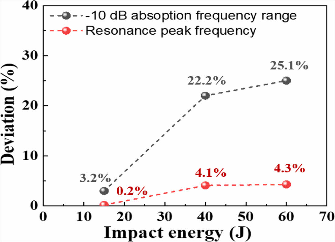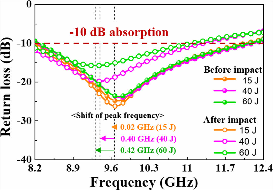 Fig. 11에는 충격에너지에 따른 레이더 흡수 구조의 90%의 전자기파를 흡수하는 주파수 대역의 너비 및 공진주파수의 변화량을 나타내었다. 15 J의 충격에너지를 가하였을 때 공진 주파수의 변화는 0.2% 수준으로 미미하였으나 충격에너지를 40 및 60 J로 증가시켰을 때 공진 주파수의 변화는 4.1 및 4.3% 수준으로 증가하였다. 더 큰 변화는 -10 dB 반사손실 주파수 대역에서 나타났다. 15, 40 및 60 J의 충격 에너지를 레이더 흡수 구조에 인가하였을 때 90%의 전자기파를 흡수하는 주파수 대역의 너비는 각각 3.2, 22.2 및 25.1% 변화하였다. 이로부터 레이더 흡수 구조에 가해진 충격에너지가 클수록 전자기파 흡수 성능의 저하가 크다는 것이 확인되었다.