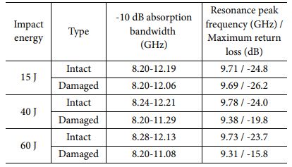 Fig. 10과 Table 3에서 저속충격시험 전, 후 레이더 흡수 구조의 전자기파 흡수 성능 특성 변화를 설명하였다. Table 내의 Intact는 손상이 없는 구조를, Damaged는 손상이 발생한 경우를 뜻한다. 15 J의 충격 에너지를 가하여 층간분리가 발생한 레이더 흡수 구조의 경우, 충격 후 공진 주파수와 -10 dB 주파수 대역이 각각 9.69 GHz, 8.20-12.06 GHz로 손상 전과 비교하여 소폭 감소되는 것으로 나타났는데 이는 구조 내부에 발생한 층간분리로 인한 미세한 공기층 형성에 의한 것으로 판단된다. 이와 같은 결과로부터 상대적으로 크기가 작은 영역의 층간분리는 레이더 흡수 구조의 전자기파 흡수 성능에 큰 영향을 미치지 않는 것으로 판단된다. 반면에 섬유 파손(40 J), 섬유 및 관통 파손(60 J)이 동반된 경우에는 공진 주파수 및 반사손실로 표현되는 전자기파 흡수 성능이 크게 저하되었다. 40 J의 충격에너지로 시험한 구조의 경우, 충격 전 대비 공진주파수가 9.78 GHz에서 9.38 GHz로 변화하였고, 60 J의 충격에너지를 가한 레이더 흡수 구조의 공진주파수는 9.73 GHz에서 9.31 GHz로 더 큰 변화를 보였다. 더욱 악화된 수치는 반사손실이다. 40 및 60 J의 충격에너지가 인가된 레이더 흡수 구조의 반사손실 Peak는 각각 -24.0 dB에서 -19.8 dB 및 -23.7 dB에서 -15.8 dB로 감소하였다. -10 dB 주파수 대역은 40 J의 경우 8.24-12.21 GHz에서 8.20-11.29 GHz, 60 J의 경우 8.28-12.13 GHz에서 8.20-11.08 GHz로 큰 폭으로 감소하였다. 충격시험을 수행하기 전 제작된 레이더 흡수 구조는 대부분의 X-band 대역의 전자기파를 효과적으로 흡수하였으나, 40 및 60 J의 충격에너지를 인가한 후에는 제 성능을 나타내지 못하는 것으로 확인되었다. 이러한 전자기파 흡수 성능 저하는 충격에너지로 인해 발생한 구조 내부의 공극에 의한 것으로 판단된다. 이에 더해 상대적으로 큰 충격에너지가 인가된 경우 레이더 흡수 구조의 형상 및 두께가 변화하기 때문에 정합조건을 정확히 이루지 못하여 이와 같은 성능 저하가 발생한 것으로 보인다.