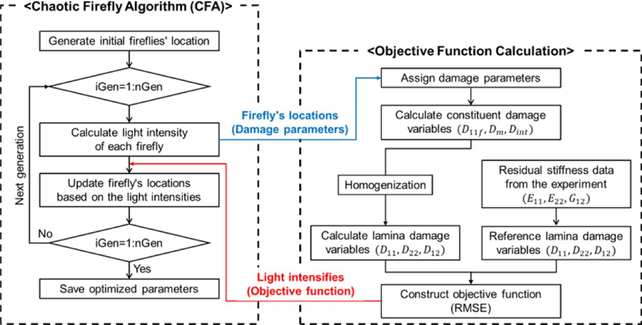 앞에서 정의된 피로 손상 변수의 파라미터들을 획득하기 위해 유전 알고리즘 기반의 최적화 방법인 chaotic firefly 알고리즘을 사용하였다[26]. 최적화를 위한 목적함수를 구성하기 위해서는 시뮬레이션 데이터와 실험데이터가 필요한데 실험데이터는 Shokrieh et al.[9]에서 측정한 피로 시험 중에서의 특정 사이클 수에 대한 잔류 강성을 사용하였다. 잔류 강성 데이터는 종·횡 방향 및 전단 방향 각각에서 대하여 존재하였고 각 방향 별 2개의 서로 다른 하중(종방향: 80, 60%, 횡방향: 60, 40%, 전단방향: 59%, 40%) 하에서 측정되었다. 잔류 강성 데이터를 통해 식 (30)에서 정의된 특정 사이클 수에서 라미나 단계에서의 손상변수를 계산할 수 있다.