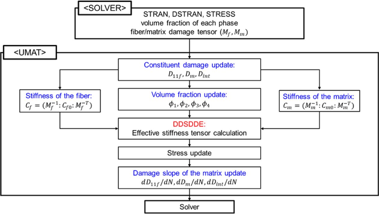 멀티스케일 피로 손상 모델을 구조해석에 적용하기 위하여 상용 유한요소해석 프로그램인 ABAQUS의 user subroutine UMAT을 통해 유한요소해석을 진행하였다. UMAT에서는 먼저 솔버에서 획득한 응력과 변형률로부터 각 구성재료별 응력과 변형률을 계산한다. 이를 통해 각 구성재료에서의 손상 텐서를 업데이트한 뒤 강성 텐서를 계산하고 각각의 구성성분들의 부피분율을 적용하여 복합재료의 유효 응력 텐서를 얻을 수 있다. 유효응력 텐서를 통해 새로운 응력을 계산하고 이 결과를 이용하여 손상 변수의 기울기를 새롭게 계산하게 된다. 특정 사이클에서 요소의 손상 변수가 특정 임계 값 이상이 되면 파손이 난 것으로 판단하고 매우 큰 값(0.99)으로 증가시킨다. UMAT의 전체적인 계산과정은 Fig. 3에 간략하게 정리하였다.