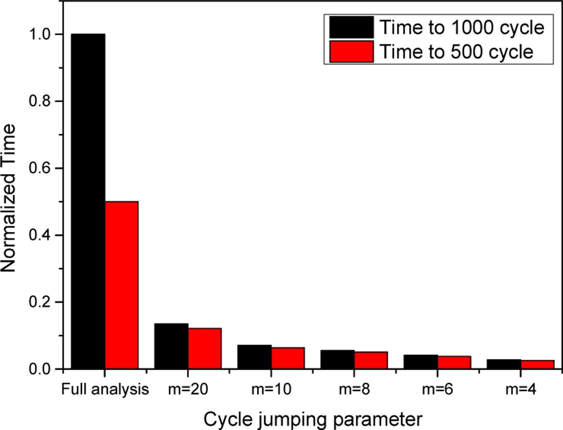 피로해석의 경우 매 사이클을 모두 고려한 유한요소해석을 수행하기에는 많은 계산시간이 소요된다. 따라서 해석시간을 줄이기 위한 많은 연구가 진행되어 왔는데 이 연구에서는 일반적으로 많이 사용되는 cycle jumping scheme을 사용하였다. Cycle jumping scheme에서는 특정사이클에서 다음 특정사이클로 해석을 건너 뛰는 과정이 존재하게 된다. Cycle jump는 Njump,n=10n/m-10n-1/m으로 주어지며 m은 cycle jump parameter, n은 step number이고 N이 증가할수록 cycle jump가 증가하게 된다. 서로 다른 cycle jump parameter m에 대한 해석시간의 비교는 Fig. 4으로 나타내었다. 해석은 모두 정적하중의 90% 피로하중을 받는 0도 라미네이트 시편에 대하여 수행되었고 500 및 1000 사이클에 도달할 때까지의 시간을 측정하였다. M이 감소함에 따라 해석시간이 빠르게 감소하는 것을 확인할 수 있다.