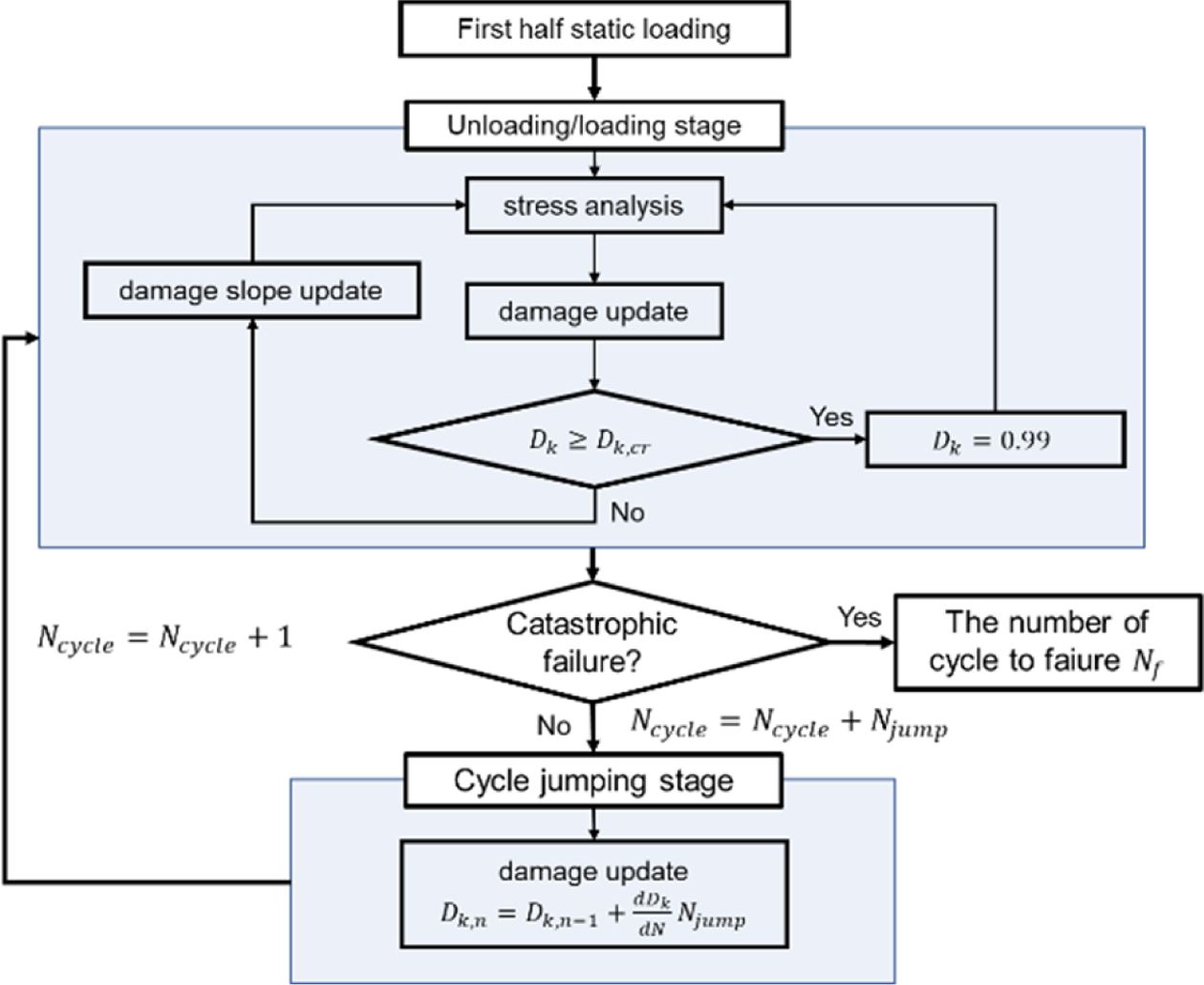 본 모델에서는 해석과정을 총 3개의 단계로 구분할 수 있다. 먼저, 피로하중에 앞서 최대 하중까지 정적 하중이 작용하게 된다(단계1). 그 이후, 피로 하중이 작용하여 최소 하중까지 감소했다가 다시 최대 하중에 이르게 된다(단계2). 이 단계에서는 반복 하중이 작용하면서 응력의 재분배가 이루어지고 요소마다 파손에 대한 해석이 이루어지게 된다. 마지막으로 특정 사이클에서 특정한 값의 사이클만큼 해석을 건너뛰는 cycle jumping 단계(단계3)가 존재한다. 이 과정에서는 손상 변수의 기울기가 일정하다는 가정 하에 손상 변수의 값만 새롭게 계산하게 된다. 위의 일련의 과정을 Fig. 4에 도식화했다.