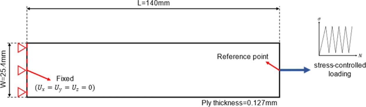 UMAT subroutine으로 구현된 멀티스케일 피로 손상 모델을 검증하기 위해 단일방향 라미네이트에 대한 피로해석 검증을 수행하였다. 먼저 검증을 위한 실험 데이터로는 Shokrieh et al.[9]의 자료를 사용하였다. 시뮬레이션의 경우 응력비가 0.1인 인장-인장(tension-tension) 피로하중에 대해 진행하였고 각각의 라미네이트에 대한 최대 응력은 Table 4와 같다.