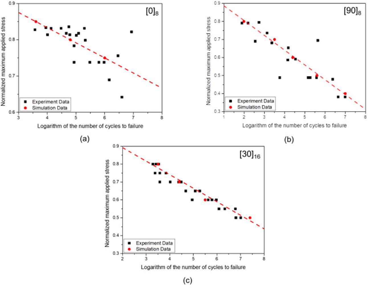 총 세 종류의 단일방향 라미네이트에 대한 해석결과 와 실험결과를 Fig. 6과 같이 S-N 선도를 통해 비교하였다. 모든 시편에 대해서 피로 수명의 시뮬레이션 결과가 실험 결과와 유사하게 얻어진 것을 확인할 수 있다. 0도 라미네이트의 경우 응력이 섬유 종방향에 대해서 매우 크게 작용하기 때문에 섬유의 종방향 손상 변수, D11f에 의하여 파손이 발생하였고, 90도 라미네이트의 경우 기지의 손상변수, Dm에 의하여 파손이 발생하는 것을 확인하였다. 이는 실제 실험의 관찰된 파손 메커니즘과 잘 일치하는 것을 알 수 있다. 30도 라미네이트 또한 90도 라미네이트와 동일한 파손 메커니즘을 가진다. 하지만 이 시편의 경우 전단 응력도 큰 값을 가지기 때문에 섬유-기지 간의 박리에 대한 손상 변수의 기여에 의하여 90도 라미네이트보다 더 작은 피로 수명을 가진다. Fig. 7
