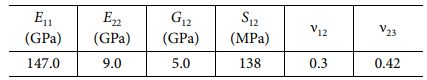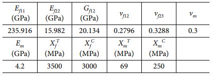 이 연구에서는 모델 검증을 위한 재료로 AS4/3501-6 적층형 복합재료를 선정하였고 해석을 위한 재료 물성은 기존의 선행 연구로부터 획득하였다. 먼저 lamina 단계에서 강성 및 강도는 Shokrieh et al.[9]의 실험 결과로부터, 기지의 강성 및 강도, 섬유의 강도는 Kaddour et al.[25]에서 실험을 통해 측정한 물성을 활용하였다. 섬유에 대한 강성은 복합재료와 기지의 강성 정보를 이용하여 균질화 기법을 통해 역해석하여 얻었다. 복합재료와 각각의 구성재료 AS4, 3501-6의 물성정보는 Table 1과 Table 2에 정리하였다.