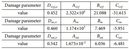 이 때, dDint/dN은 섬유-기지 간의 박리에 대한 손상변수 기울기, G12는 재료의 전단 탄성계수, Δσ122는 반복하중에 대하여 최대 전단응력과 최소 전단응력의 제곱 값의 차이, 그리고 Aint, Bint, Cint는 손상 변수 파라미터이다.