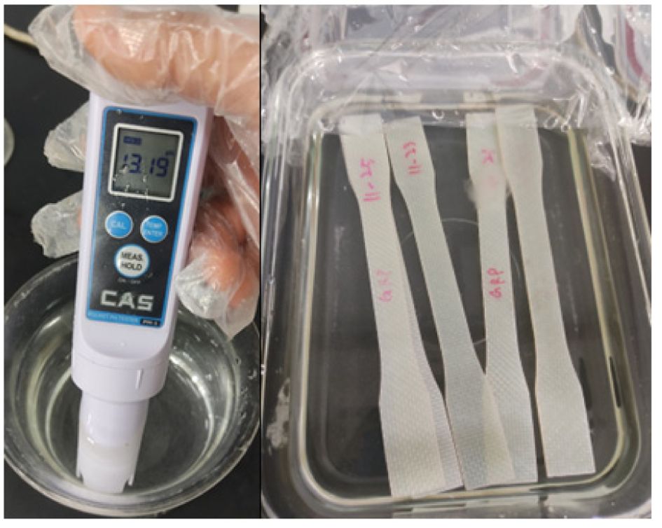 복합재 부식에 대한 내구성 평가를 위해 마찰 및 마모 시험을 수행하였으며, 스위스 CMS 사의 Pin-On Disk 시험기를 사용하였다. 마찰 및 마모 시험은 염기성 분위기 용액에서 일정시간 시험편을 침지 및 노출시킨 후 수행되었으며, 이 때 사용한 염기성 용액은 NaOH를 증류수에 1 mol 혼합하여 제조하였다. Fig. 1은 본 연구에서 사용된 실제 용액에 대한 pH를 측정한 것으로, 13.19 pH 알칼리성 환경을 설정하였다. 장시간 시험편이 노출될 경우, 내부 용액 증발에 따른 pH 변화를 방지하기 위해 밀봉하였으며, 최대 720시간까지 용액에 침지하였다. Fig. 2