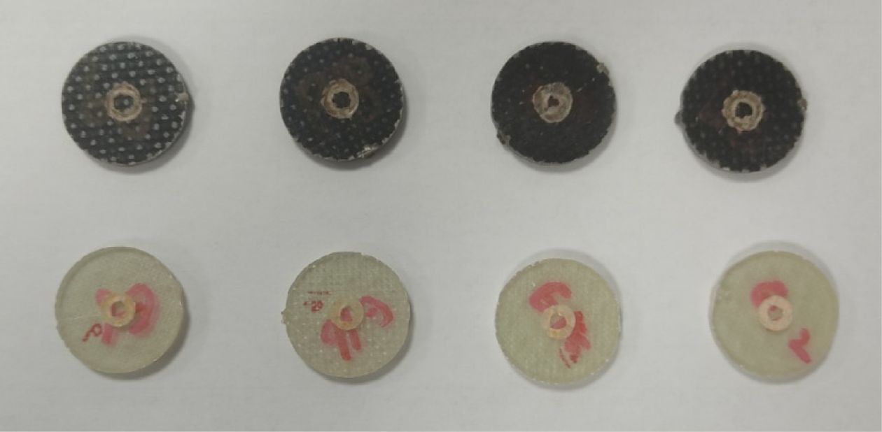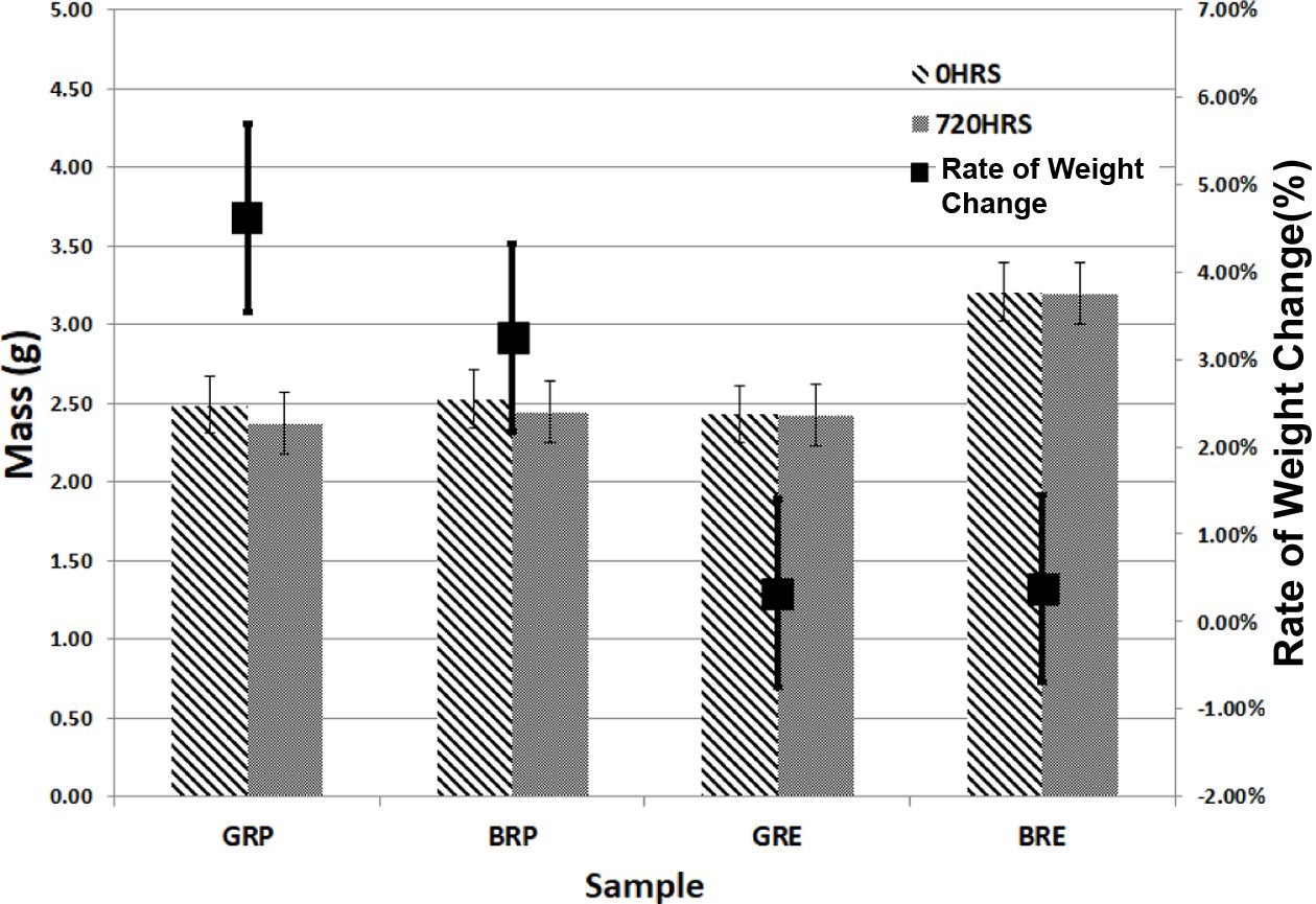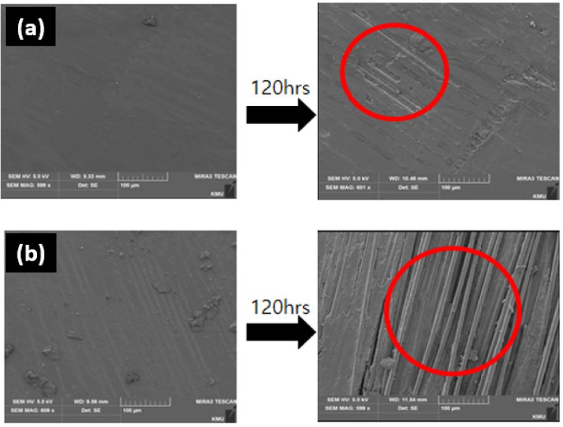 Fig. 5에서와 같이 NaOH 용액에 120시간 노출되었을 경우 표면에서의 변화를 관찰할 수 있으며, 이는 섬유계면에서의 수지 탈락을 단적으로 보여준다[6]. GRE와 GRP의 침지 120시간 이후, 표면 열화가 진행되어 섬유가 밖으로 드러나는 형태를 관찰할 수 있었다. 하지만, GRP의 경우, GRE대비 더 많은 섬유가 표면으로 노출되는 것을 관찰할 수 있었다. 이는, 수지와 섬유간의 계면 결합력 차이에서 발생되는 열화 정도가 다른 것으로 사료된다[7]. 계면 결합력이 상대적으로 낮은 불포화폴리에스테르 수지의 표면 열화 정도가 더 많이 진행된 것으로 사료된다. 또한, 해당 수지 열화 및 섬유에서의 수지 탈락은 무게 변화율과도 영향이 있는 것으로 추측된다. 상대적으로 많은 수지의 열화 및 탈락 현상은, 시료 전체 무게 변화에 영향을 준 것으로 사료되며, 마찰계수까지 영향을 미치는 것으로 판단된다.