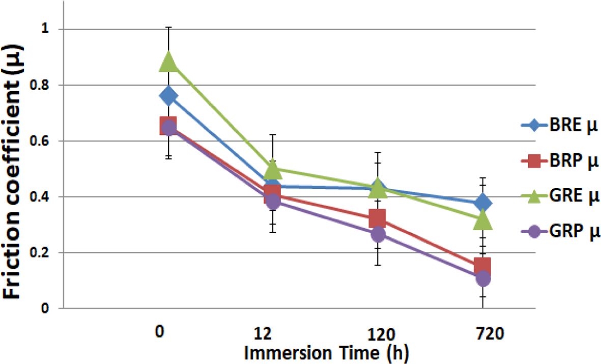 Fig. 3에서 볼 수 있듯이, GRP, BRP의 침지 전 마찰계수의 경우, 약 0.65의 마찰 계수를 나타냈으며, 알칼리 용액에서의 침지 시간이 길어짐에 따라 마찰 계수는 지속적으로 하락하는 것을 확인할 수 있었다. 특히, 720시간 침지한 경우, GRP와 BRP는 각각 0.11, 0.14 마찰 계수를 가지며 두 시료 모두 GRE, BRE 대비 낮은 마찰계수를 보였다. 이는 불포화폴리에스테르 수지와 섬유 간의 계면결합력이 상대적으로 낮아, NaOH가 내부로 급격히 침투하여 내부 열화까지 진행 된 결과라 판단된다. 또한, GRE와 BRE의 침지 전 마찰 계수는 각각 0.88, 0.76를 가지며 GRP, GRP 대비 약 10% 높은 수치다.