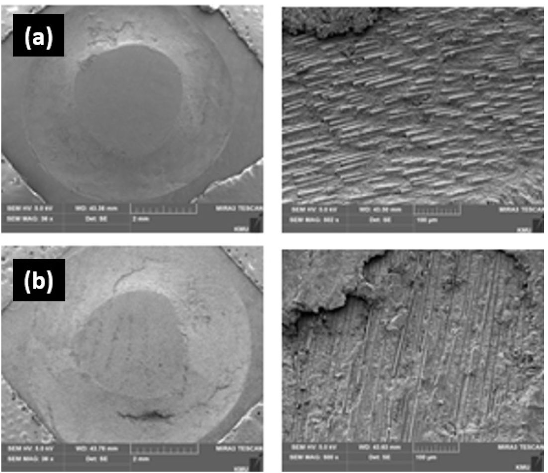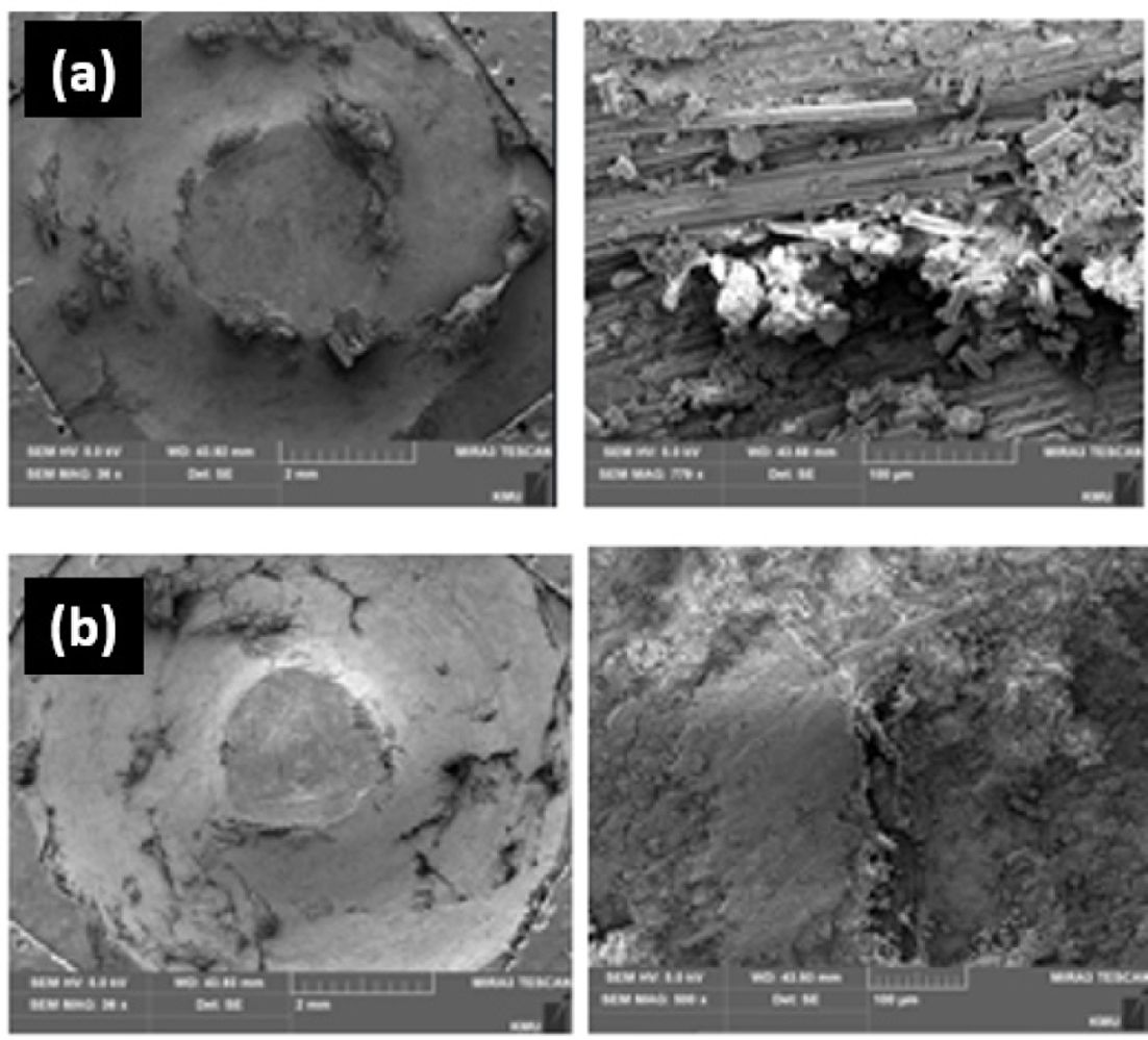 Fig. 7 Damaged surface after friction test of samples immersed in NaOH for 720 hours: (a) GRE, and (b) BRE |