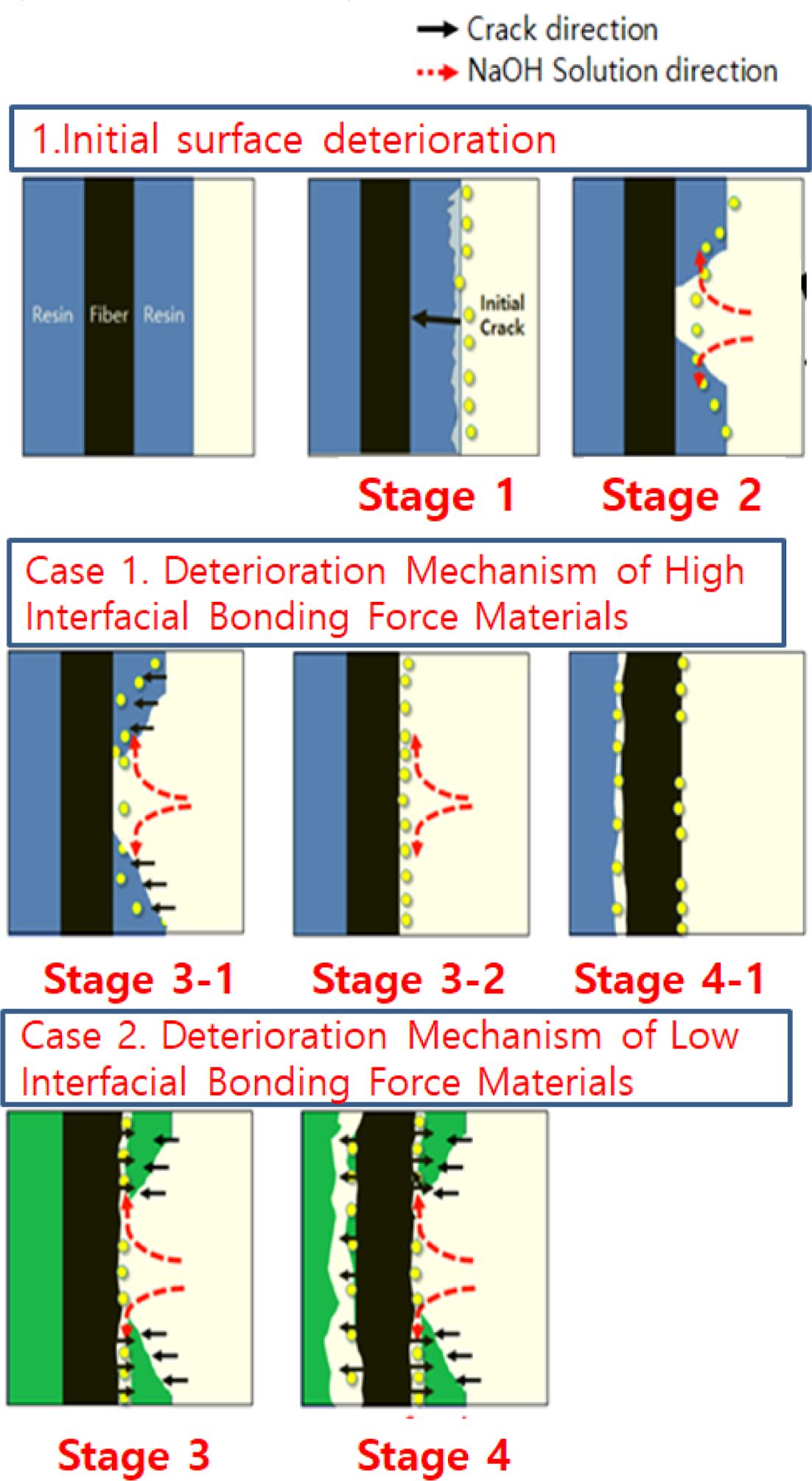 이후 Stage는 계면결합력에 따라 차이를 보이게 된다. Stage 3-1~Stage 4-1의 경우, 계면결합력이 상대적으로 우수한 Case를 나타내었다. 표면 열화는 진행되었지만, 섬유와 수지간의 높은 계면결합력으로 NaOH의 내부 침투는 어려우며, 표면의 수지만 열화 시키게 된다(Stage 3-2) 이후, 지속적인 침지가 진행되면, 최종적으로 Stage 4-1와 같이, 재료 내부까지 열화가 진행된다.