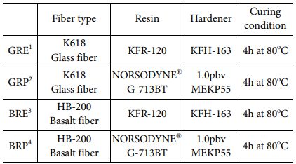 본 연구에서 사용된 섬유강화복합재료는 BRE(Basalt fiber reinforced epoxy), BRP(Basalt fiber reinforced unsaturated polyester), GRE(Glass fiber reinforced epoxy), GRP(Glass fiber reinforced unsaturated polyester)로, 현무암(HB-200, GM Composite) 및 유리섬유(K618, GM Composite)는 평직으로 직조된 형태를 사용하였으며 고분자 기지재 불포화폴리에스테르 수지(Unsaturated Polyester Resin, Motionfive Inc.)와 에폭시 수지(Epoxy, Kukdo Chemical Co., LTD.)에 각각 함침시켜 시험편을 제조하였다.