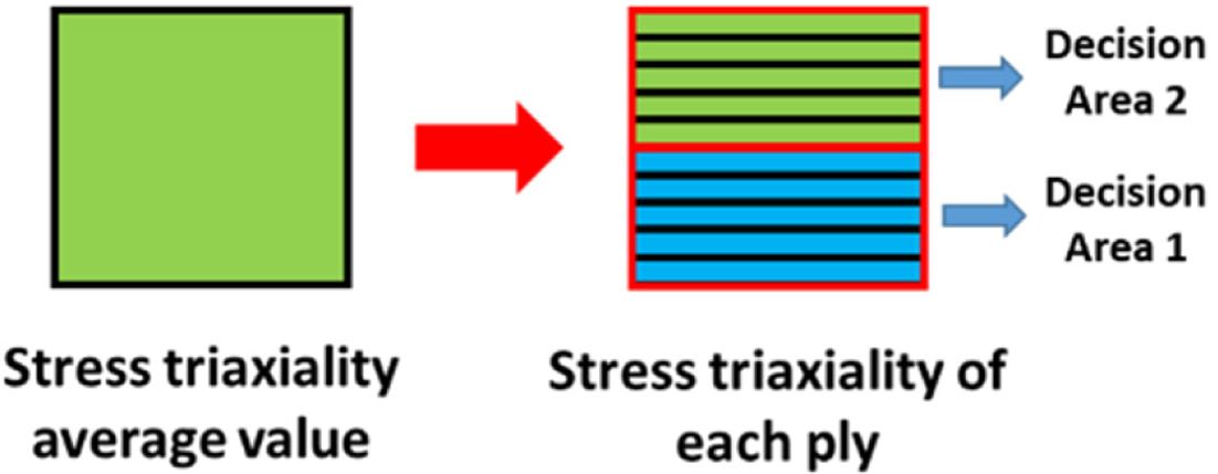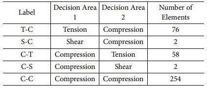 머신 러닝 기법이 PIC 설계 방법에 적용되기 위하여 우선적으로 학습 데이터가 생성되어야 한다. 학습 데이터를 생성하기 위하여 선행 유한요소해석을 통해 참조 요소에서의 응력 3축 특성 값 데이터를 얻었으며, Fig. 2와 같이 좌굴을 유도하기 위하여 사각관 형태의 유한요소 모델을 압축시키는 경계 조건으로 유한요소해석이 진행되었다. 상단부에서 변위가 제어되었으며, 변위 제어 속도는 5 km/h이다. 적층 된 플라이의 수는 30장이며, 요소의 개수는 3,200개이며, 참조 요소의 개수는 전체 요소의 약 12%인 392개이며, 배치는 규칙적으로 이루어졌다. 학습 데이터 특성 값은 참조 요소의 좌표로, 라벨은 하중 유형 판별 데이터로 이루어진다. 기존에 제안된 PIC 설계 기법에서의 하중 유형 판별 방법은 하나의 요소에서 각 플라이의 응력 3축 특성의 평균값을 통해 판별되었다[9]. 하지만 좌굴이 발생하였을 경우, Fig. 3에 나타난 것과 같이 윗부분 플라이에는 압축 하중, 아랫부분 플라이에는 인장 하중이 지배적인 것으로 나타나게 된다. 이러한 좌굴을 고려하기 위하여 본 연구에서는 Fig. 4에 나타난 것과 같이 두 개의 동일한 크기의 판단 영역을 설정하여 판단 영역 1, 2에서 가장 많은 하중 유형으로 나타난 것이 대표 하중 유형 1, 2라 정의되었다. 라벨은 각 판단 영역(Decision Area) 1, 2 순서대로 표기되었으며, 그 결과는 Table 1과 같다. 하중 유형 중 압축 유형이 지배적인 것으로 나타났으며 전단 유형은 다른 하중 유형보다 적게 나타난 것으로 나타났다.