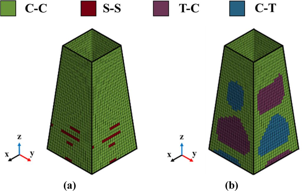 Fig. 5(a)는 기존에 제안된 PIC 기법을 통하여 예측된 데이터가 매핑 된 유한요소 모델이며, Fig. 5(b)는 본 연구에서 제안된 PIC 설계 기법을 통하여 예측된 데이터가 매핑 된 유한요소 모델이다. 기존의 방법에서는 하중 유형이 압축 유형이 지배적으로 나타났으며, 이는 각 요소에서의 응력 3축 특성을 평균 값으로 하중 유형이 판단되었기 때문으로 사료된다. 반면 제안된 PIC 기법은 좌굴에 의해 변형된 부분에서 하중 유형 T-C와 C-T로 예측되었으며, 그 외의 부분에서는 C-C로 예측되었다. 하지만, 참조 요소의 수가 상대적으로 적었던 S-C 및 C-S에 대하여 머신 러닝 모델이 예측하지 못한 것으로 나타났다.