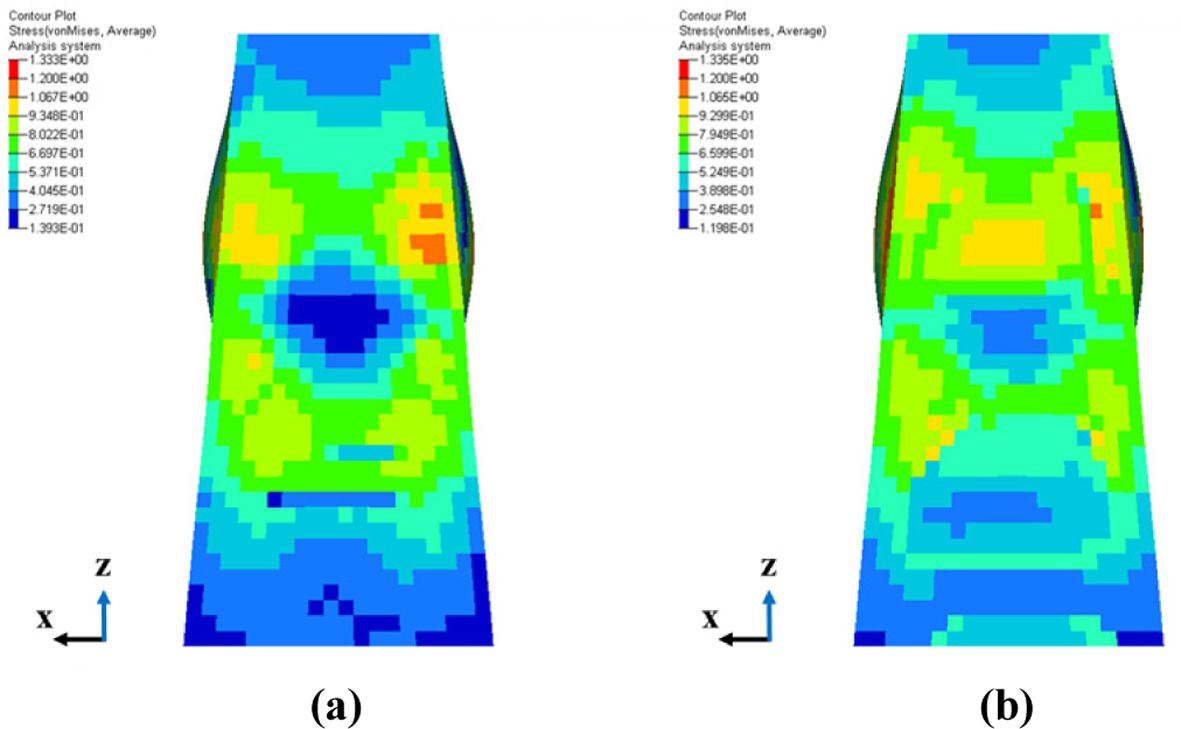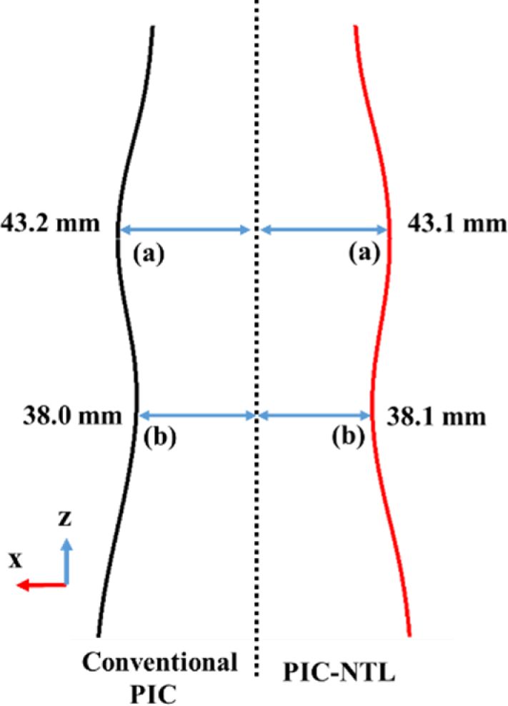 Effective stress contours는 Fig. 7과 같이 나타났으며, 기존에 제안된 PIC 설계 방법으로 모델링 된 사각관에서 더 많은 응력을 받는 것으로 나타났을 뿐만 아니라 국소 영역에서 응력이 집중되는 것으로 나타났다. 이는 해당 국소 영역에서 파단이 쉽게 일어날 것으로 보인다. 그리고 Fig. 8에 나타난 것과 같이 기존에 제안된 PIC 대비 PIC-NTL로 설계된 사각관의 좌굴에 인한 변형량 차이는 각각 (a), (b)에서 약 0.3%, 0.2%로 유사하게 나타났다. 이를 통해 기존의 적층 각도 순서 배치가 사각관의 변형량에 미치는 영향이 낮은 것으로 사료된다.