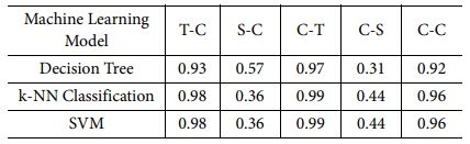 머신 러닝 모델 중 SVM 모델이 가장 높은 예측률로 나타났으며, ROC-AUC의 각 라벨의 평균값도 가장 높게 나타났다. 각 모델의 ROC-AUC 중, S-C와 C-S에서 상대적으로 낮은 값으로 나타났는데, 이는 참조 요소의 수가 상대적으로 적었기 때문이라 사료된다.