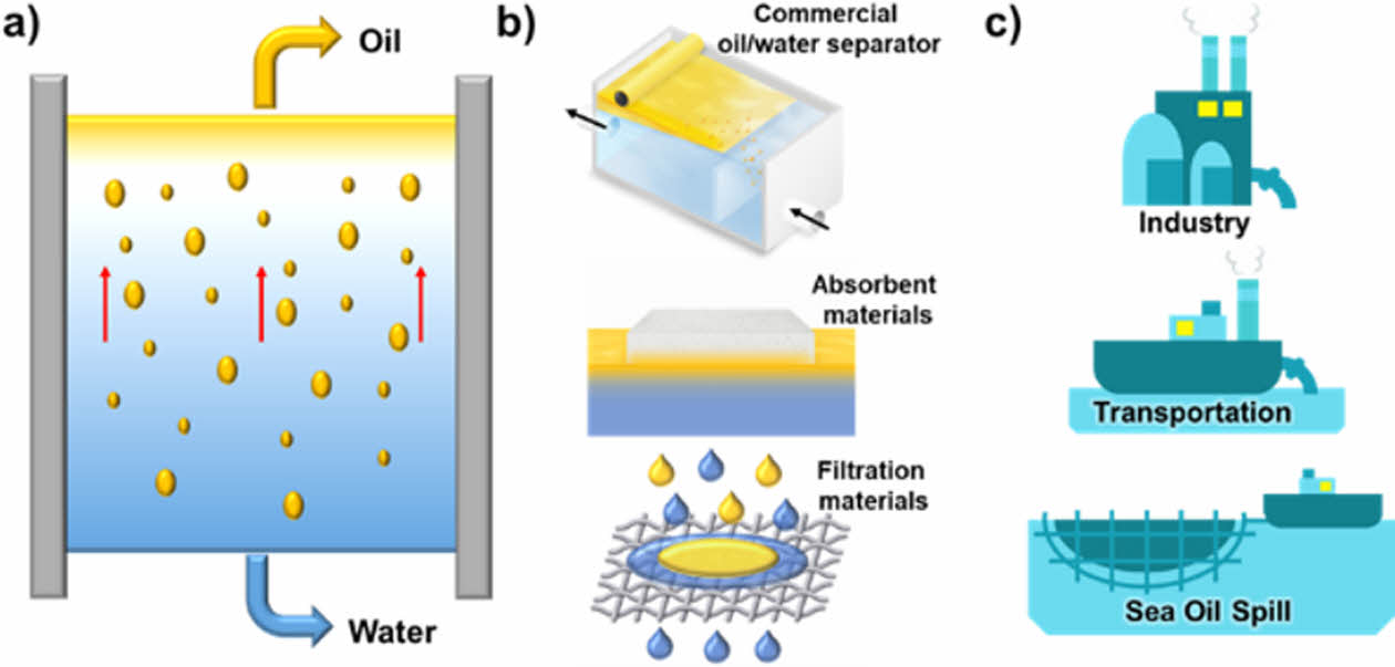 Fig. 1 a) Mechanism of oil-water separation. b) Three typical types of oil-water separation methods. c) Various applications in oil-water separation field |