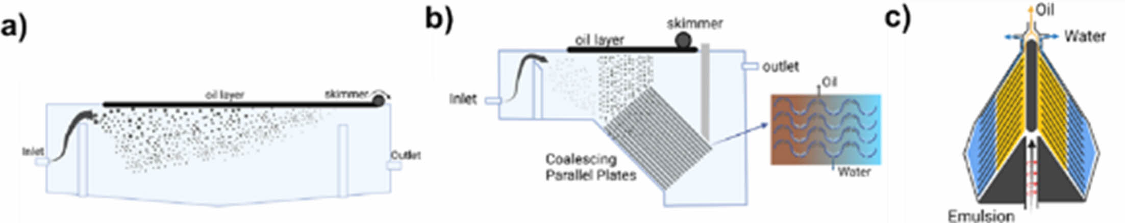 Fig. 2 A scheme of a) American petroleum institute separator. b) Corrugated plate interceptor separator. c) Centrifugal separator. Reproduced with permission from Ref. [45]. Copyright 2022, ELSEVIER BV |