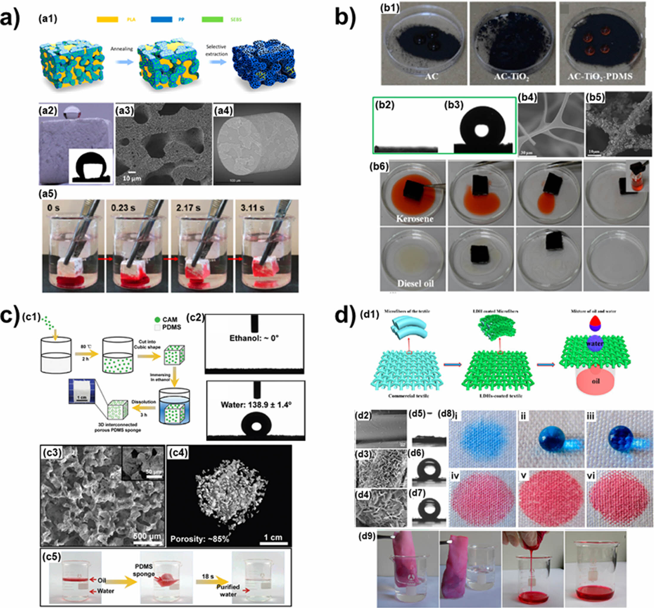 Fig. 3 Various oil absorbents for oil-water separation. a) Hierarchically porous PP through annealing and selective extraction. (a1) Scheme showing the ternary polymer blending strategy to prepare the hierarchically porous PP. (a2) Digital image of a water drop on the surface of the prepared hierarchically porous PP. (a3) SEM image of hierarchically porous PP. (a4) 3D X-ray nano-CT scan of the hierarchically porous PP. (a5) Digital photos showing the effect of the pore diameter on the chloroform sorption rate under water using the porous PP. Reproduced with permission from Ref. [50]. Copyright 2021, American Chemical Society. b) Superhydrophobic sponge coated by AC. (b1) Pictures showing the water drops positioned on various powders of AC, AC-TiO2, and AC-TiO2- PDMS. WCAs for (b2) pure sponge and (b3) coated sponge. SEM images of (b4) the pure sponge and (b5) coated sponge. (b6) Absorption processes for various types of oils from water by the coated sponge. Reproduced with permission from Ref. [51]. Copyright 2020, American Chemical Society. c) Porous PDMS oil-absorbent using CAM (c1) Schematic illustration of the preparation of the 3D interconnected porous PDMS sponge. (c2) Ethanol and water contact angles on the surface of porous PDMS. (c3) SEM image of the porous PDMS sponge. (c4) Micro-CT image of the porous PDMS sponge. (c5) The performance of porous PDMS sponge in oil/water separation process. Reproduced with permission from Ref. [52]. Copyright 2016, WILEY-VCH. d) Layered Double Hydroxide (LDH)s coated textile. (d1) Illustration of the modification of commercial Textile with LDH and its application for oil-water separation. SEM images of (d2) pristine, (d3) LDH coated and (d4) sodium laurate treated textile. Water contact angle (d5) of pristine, (d6) of LDH coated textile before, and (d7) after the modification with sodium laurate. (d8) Photographs of (i-iii) water and (iv-vi) oil placed on the surface of the above three kinds of textiles. (d9) Photographs of oil adsorption and recycling process by using the superhydrophobic textile. Reproduced with permission from Ref. [53]. Copyright 2014, American Chemical Society |