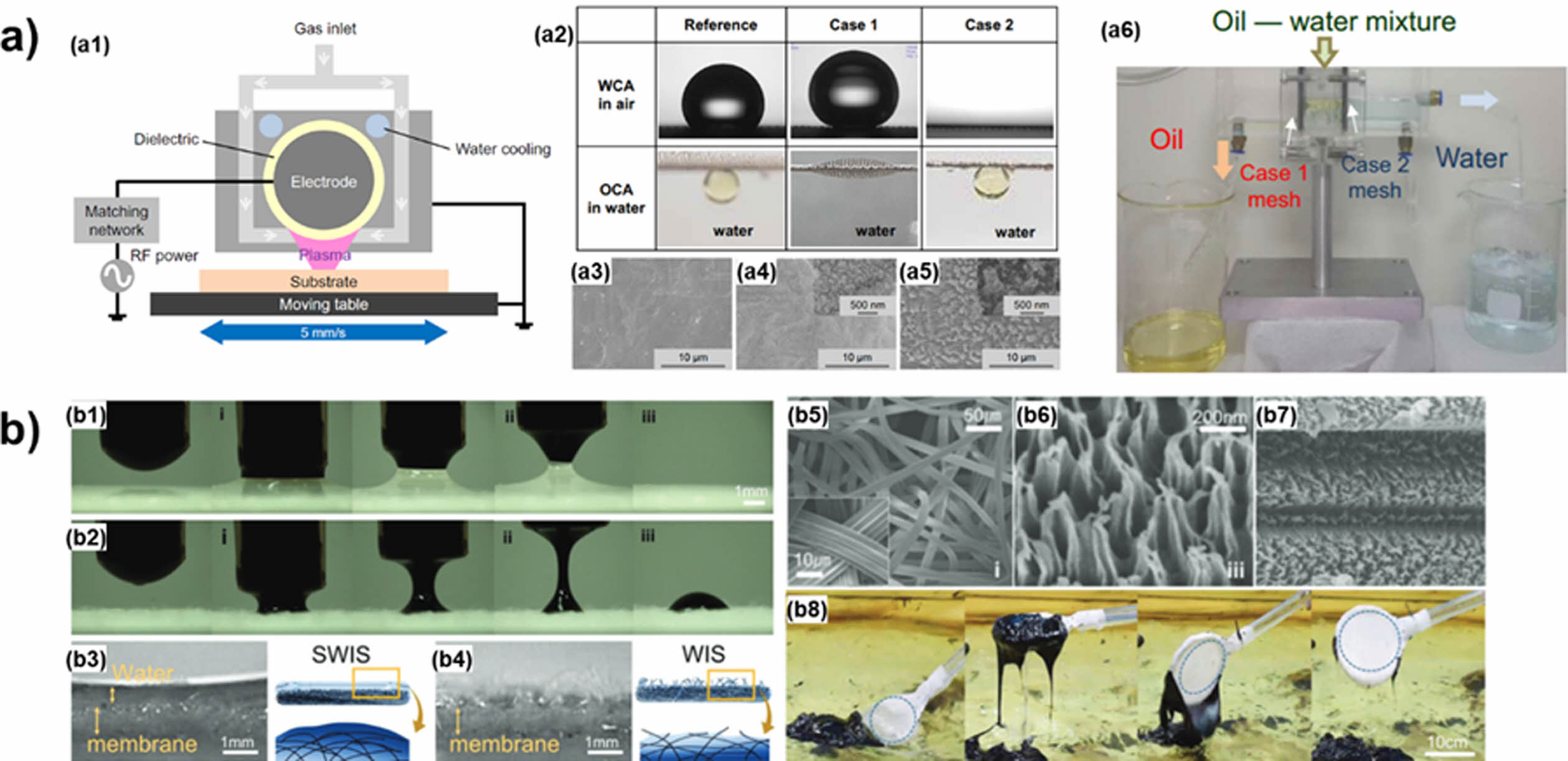 Fig. 4 Plasma-treated filters for oil-water separation. a) Functionalized membranes using cold plasma. (a1) Schematic illustration of the atmospheric-pressure plasma source. (a2) Water contact angle in air and oil contact angle in water for untreated mesh (reference), plasma treated mesh with case 1 and case 2. (a3-5) SEM images of untreated, case 1 and case 2, respectively. (a6) The device during continuous and simultaneous oil–water separation experiment. Reproduced with permission from Ref. [56]. Copyright 2021, Springer Nature. b) Membrane with grooved nanotrichomes for lubricating-induced oil repellency. Oil repellency behavior by oil attachment and detachment procedure on the fibrous membranes with the SWIS and the WIS under the same condition. A heavy oil droplet was touched, spread, and lifted on the membranes with (b1) the SWIS and (b2) the WIS, which were covered (b3) with and (b4) without the thick water layer, respectively. (b5) A membrane of cellulose fibers 10–20 μm in diameter with (b6) GNT structures and (b7) two microchannels fully covered with GNTs fabricated by plasma etching. (b8) A series of oil scooping-releasing procedure. Reproduced with permission from Ref. [57]. Copyright 2022, Wiley-VCH |