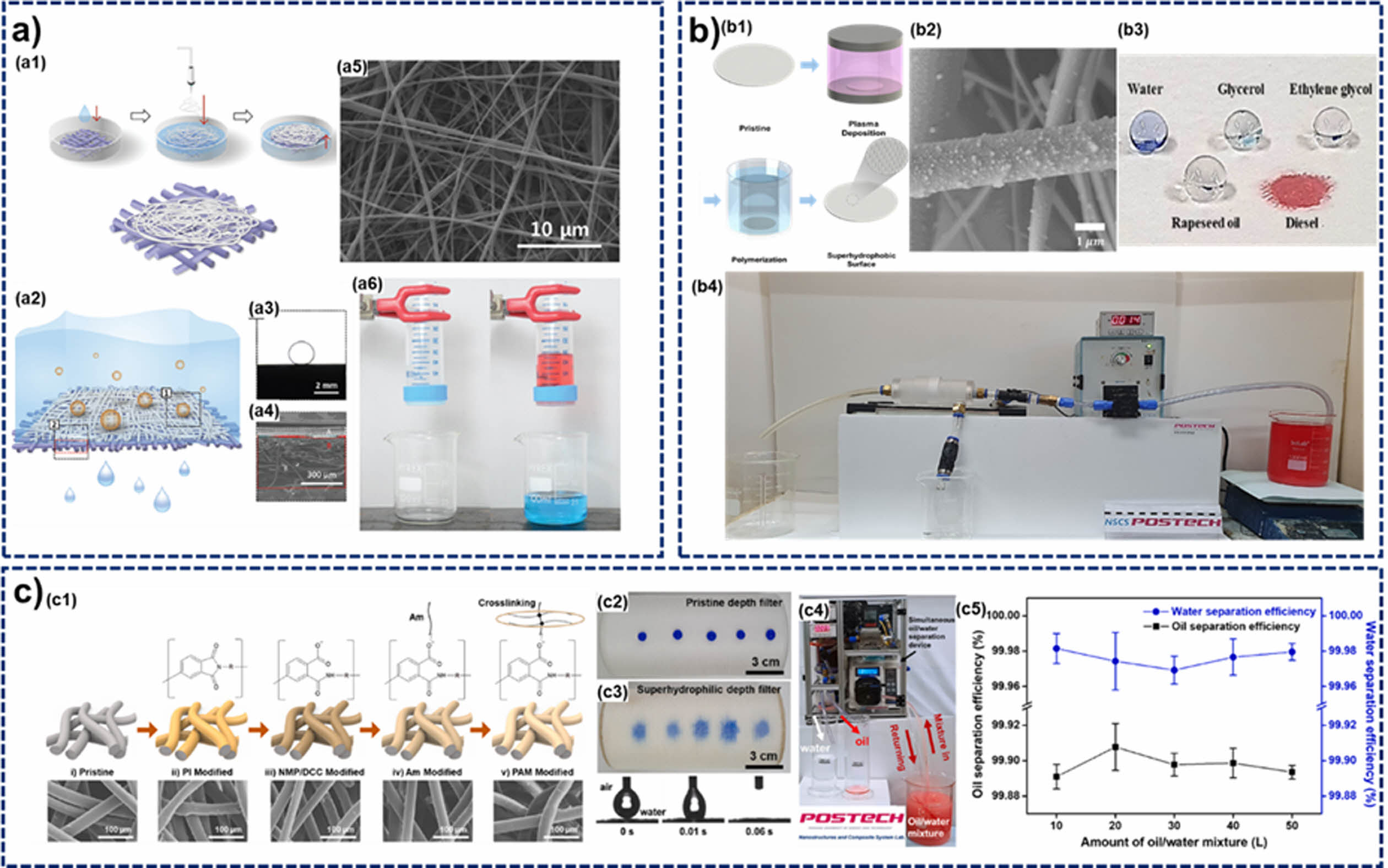 Fig. 5 a) underwater superoleophobic nanofibrous cellulosic membrane. (a1) Fabrication process of the NFC membrane. (a2) Schematic diagram of an oil/water separation with the underwater superoleophobic NFC membrane. (a3) Underwater oil contact angle. SEM image of (a4) cross and (a5) surface of the NFC membrane. (a6) Experimental set-up of the oil/water separation process. Reproduced with permission from Ref. [60]. Copyright 2018, The Royal Society of Chemistry. b) Superhydrophobic glass microfiber membrane. (b1) Fabrication process. (b2) SEM images of modified GMF membrane. (b3) Optical images of liquid droplets with different surface tensions on modified GMF membrane. (b4) Continuous oil/water separation device. Reproduced with permission from Ref. [61]. Copyright 2020, Springer Nature. c) Robust superhydrophilic depth filter and oil/water separation device. (c1) Schematic illustration of the PAM modified filter fabrication process. Photograph of water droplets on (c2) the pristine depth filter and (c3) the PAM modified depth filter. (c4) Simultaneous separation of oil and water using the developed device. (c5) Oil and water separation efficiency during continuous treatment of 50 L of an oil/water mixture. Reproduced with permission from Ref. [62]. Copyright 2021, ELSEVIER |