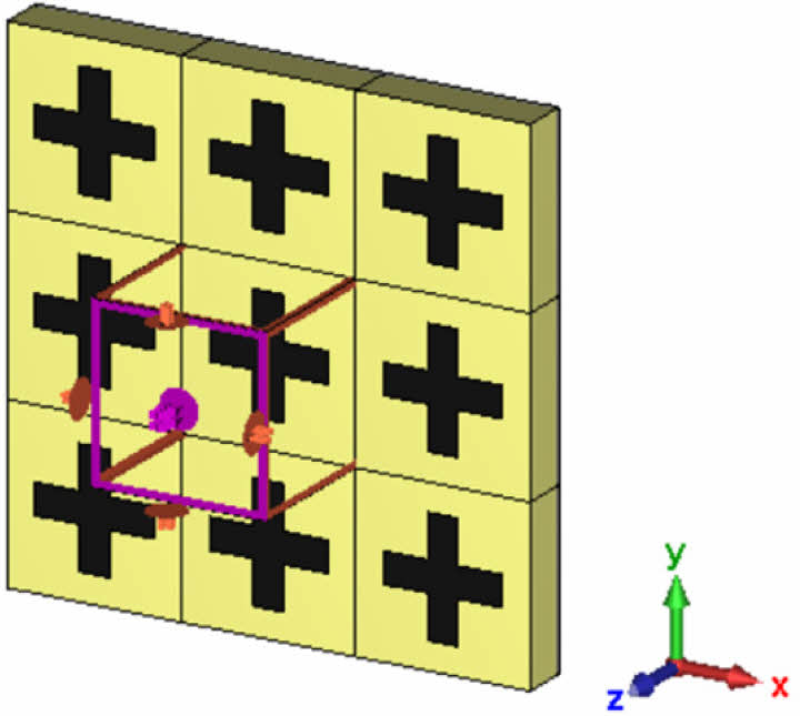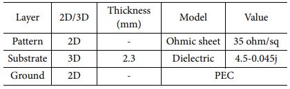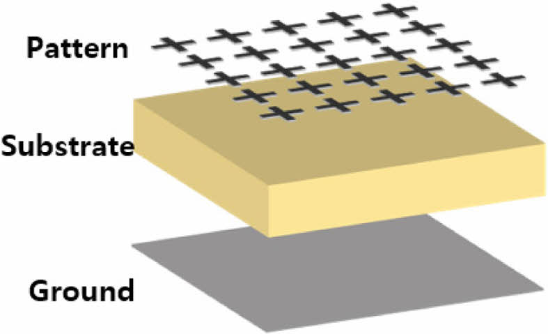 CST의 solver는 Frequency Domain Solver(F-solver)를 이용하였다. Fig. 3은 해석 모델의 경계조건을 보여준다. Unit-cell Boundary를 X, Y축 방향으로 적용하였다. Unit-cell Boundary는 하나의 Cell이 주기적으로 반복되는 경우에 사용하는 경계 조건으로, 해당 조건 사용시 하나의 Cell이 무한하게 반복된다고 가정, Floquet mode로 해석을 수행한다. 본 논문에서는 X축, Y축 방향으로 패턴이 무한하게 반복된다고 가정하여 X축, Y축 방향으로 해당 경계 조건을 적용하였다. 입사 각도는 X-Y 평면에 수직으로 입사하는 경우만을 고려하였다.