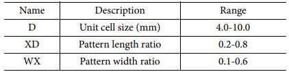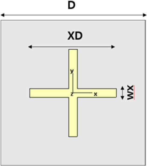 CA 전파 흡수 구조는 저항성(전도성) 패턴, Substrate, Ground 층으로 구성이 된다. 패턴과 Ground층은 2D Sheet 모델을 사용하였고 Substrate 층은 3D Solid 모델을 사용하였다. 패턴의 면저항 값은 스크린 프린팅 장비와 상용 카본 잉크 소재로 구현 가능한 면저항 값을 고려하여 35 ohm/sq를 2D Ohmic Sheet 모델에 사용하였다[7]. Substrate의 유전율은 항공용으로 사용이 검증된 유리섬유 직물 강화 복합재 소재인 MXB 7668/7781 Glass Epoxy Prepreg 소재의 자유공간 측정장비 유전율 측정값을 사용했다. 측정 값은 유전율 실수부 4.5, 허수부 0.045이다. Substrate의 두께는 CA 전파 흡수 구조 두께로 일반적으로 널리 사용하는 1/4 파장 값을 사용했다[7]. 파장 계산에 사용한 주파수 기준 값은 15 GHz로, 계산 결과 약 2.3 mm였다. Ground 반사판 소재 해석 모델에는 Perfect Electric Conductor(PEC)를 사용하였다. 패턴의 형상은 Cross-Dipole 패턴을 이용하였는데[15], Cross-Dipole 패턴의 해석 변수들은 Fig. 2와 Table 2에 명시된 바와 같이 D, XD, WX 3종류를 사용하였다. 변수 D는 패턴간 간격을 포함한 패턴 반복 주기의 절대적인 크기(mm)를, XD는 D 대비 패턴의 상대적 길이 비율을, WX는 패턴의 길이 대비 상대적 선폭 비율을 의미한다. 각 변수 값의 범위는 D는 4부터 10, XD는 0.2부터 0.8, WX 값은 0.1부터 0.6을 사용하였다. CA 전파 흡수 구조는 패턴의 설계에 따라 등가 Capacitance 값과 Inductance 값이 달라지고 이 등가 Capacitance와 Inductance 성분의 공진에 의해 공진 주파수 및 전파 흡수 성능이 결정된다. Cross-dipole 패턴은 타 패턴들과 비교하였을 때 상대적으로 높은 Inductance 값을 가져야 목표 주파수 대역에서 공진점을 확보할 수 있는데[17], Inductance 값은 선폭의 두께에 반비례한다. 따라서 선폭이 너무 크면 등가 Inductance 값이 작아져 목표 주파수 대역에서 공진점을 확보할 수 없다. WX 값이 0.6인 경우 Cross-dipole 패턴의 길이를 한 변의 길이로 하는 정사각형 면적에서 Cross-dipole 패턴의 면적이 84%에 이를 만큼 패턴이 두꺼워지고 비대해져서 적절한 등가 Inductance 값을 확보할 수 없다. 따라서 WX 값은 Cross-dipole 패턴이 적절한 등가 Inductance 값을 가지도록 0.1에서 0.6 사이의 값을 사용하였다.