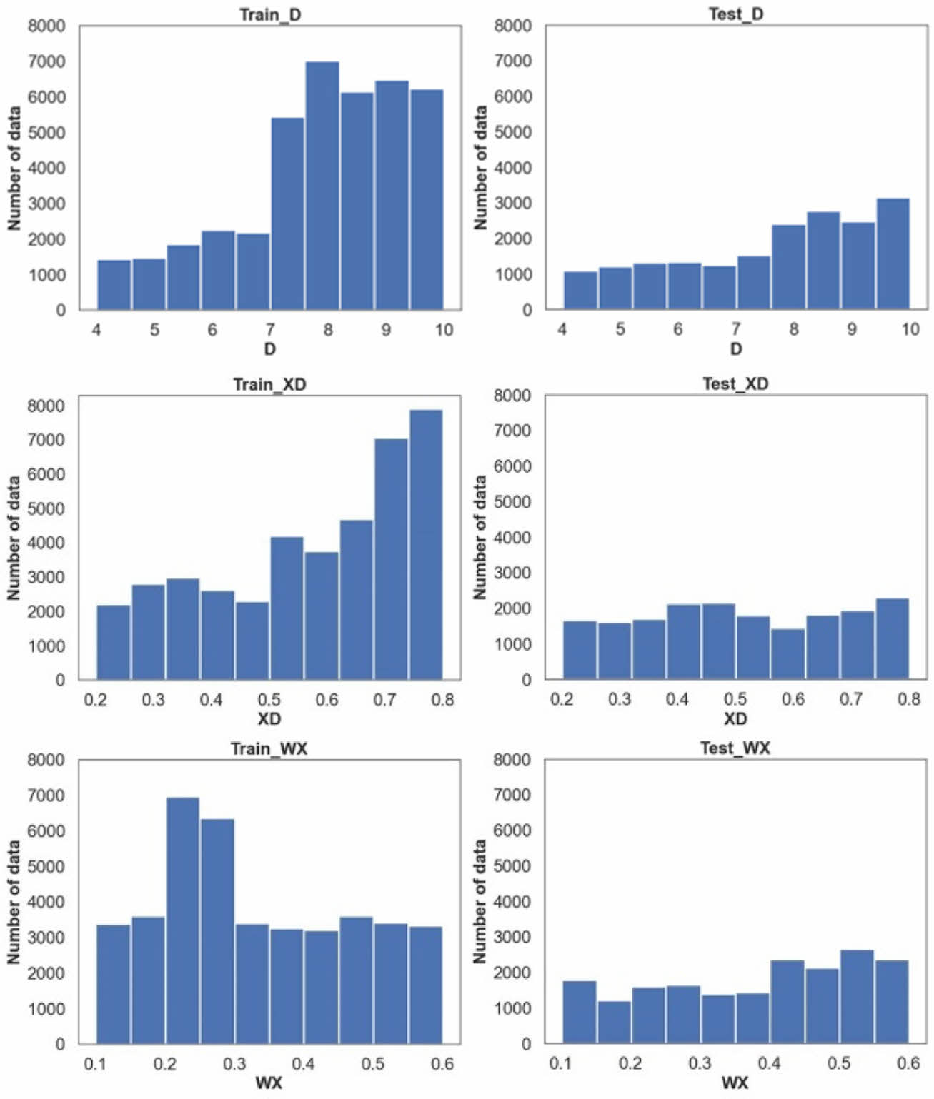 Fig. 4 D, XD, WX design variable data distribution (left : training data, right : test data) |