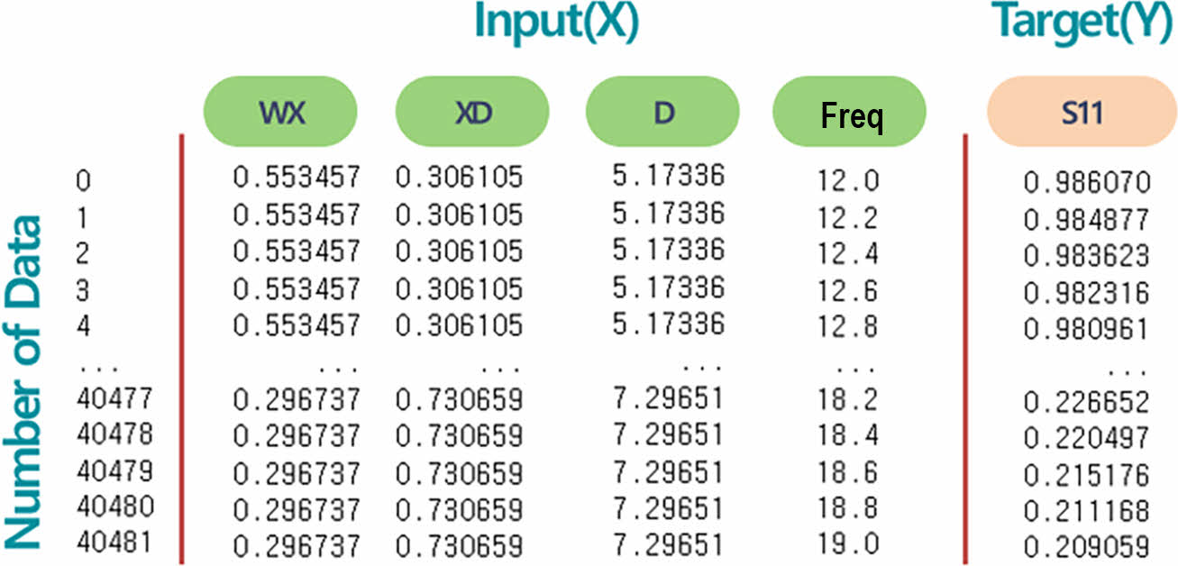 머신러닝 및 딥러닝은 그 목적에 따라 분류 모델과 수치 Data를 Fitting하는 회귀(Regression) 모델로 분류할 수 있는데, CA 전파 흡수 구조 설계에 사용하는 목적 함수 출력값은 전파 흡수 성능(S11)으로, 연속적인 수치 Data이므로 회귀 모델을 이용한다. 회귀 모델에 사용하는 변수는 학습용 입력 변수(X)와 최적화 목표인 Target(Y) 변수로 분류가 되는데 전파 흡수 구조 설계의 최종 목표는 S11(반사계수) 최소화이므로 입력 변수(X)로 해석 변수(D, XD, WX) 값과 주파수(Freq)를, Target(Y) 변수로는 S11 값을 지정해주었다. S11 값은 Linear Scale 값을 학습시에 사용해 주었다.