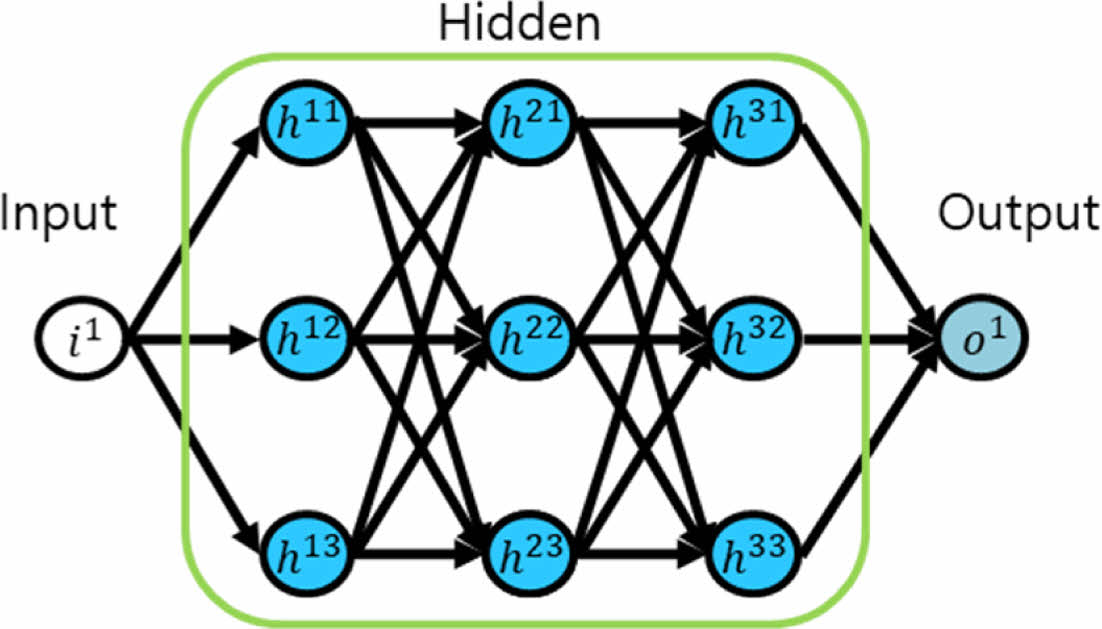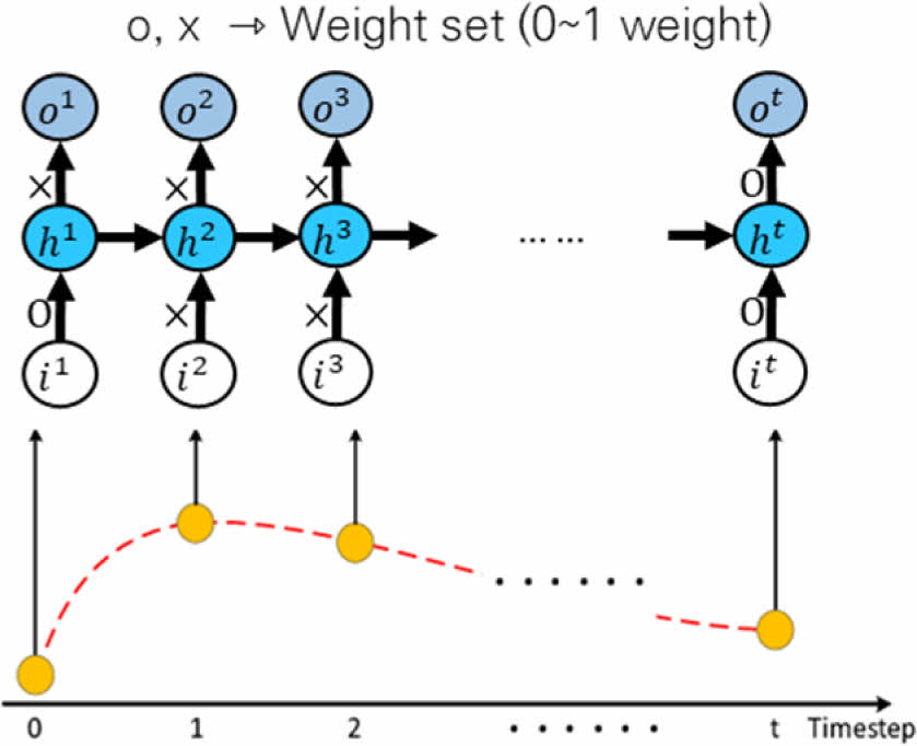 Fig. 7은 Fully-Connected(FC) 모델 Weight Update 모식도를 보여준다. Fully-Connected 모델은 그 이름이 의미하듯 입력, 출력 및 Hidden Layer의 Node가 동일 계층을 제외하고는 전부 연결되어 있다. 이 때문에 Node수와 층수(Depth)가 증가할수록 그 연산량이 폭발적으로 증가한다. Fully-Connected 모델과 LSTM 모델의 주요한 차이점은 LSTM 모델과 달리 Fully-Connected 모델은 Parameter Sharing이 없다는 점이다.