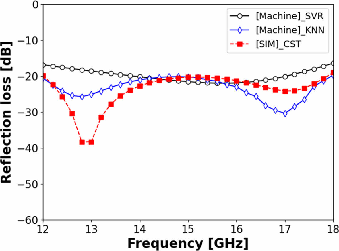 Fig. 9 SVR, KNN model, and CST simulation result at the Kuband optimized design |