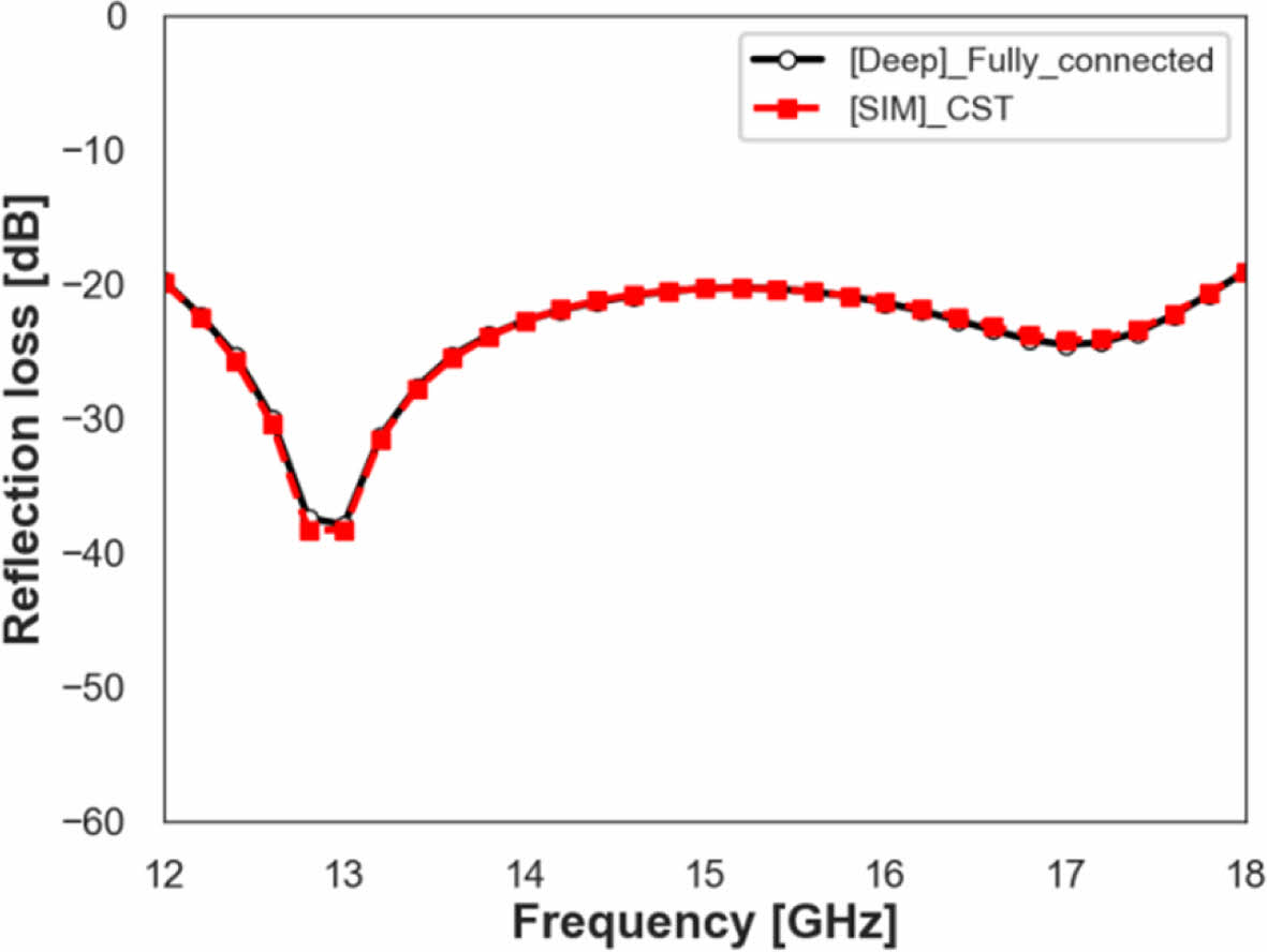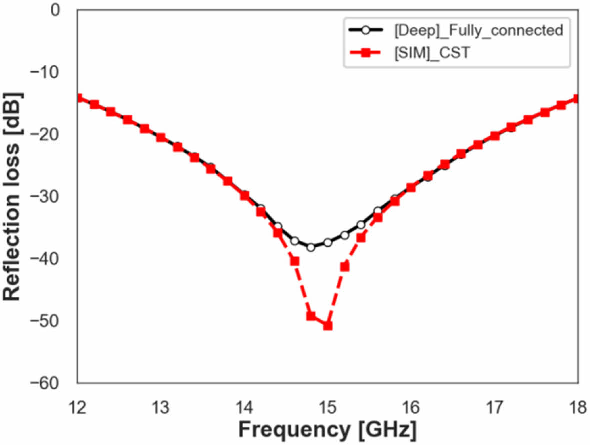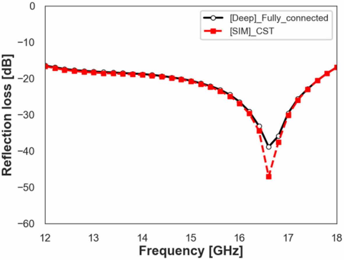 Fully-Connected 모델의 활용을 위해서 단일 주파수 대역에서 최적의 전파 흡수 성능을 보여주는 전파 흡수 구조 설계가 가능한지 확인해 보았다. Fig. 12, 13은 해당 모델을 활용해서 각각 15 GHz, 16.5 GHz에서 최적의 전파 흡수 성능을 보여주는 패턴 형상 값을 찾고, 해당 패턴 형상에서 모델을 이용해서 얻은 전파 흡수 성능 예측 결과와 CST 해석 결과를 비교한 것이다. 15 GHz 최적 설계 형상은 D 값 7.8, XD 값 0.7, WX 값 0.2이고, 16.5 GHz 최적 설계 형상은 D 값 7.8, XD 값 0.76, WX 값 0.2이다. Fig. 12, 13에서 볼 수 있듯 Peak 지점의 세기에서는 약간의 차이가 있으나 그 경향성 및 공진주파수는 정확히 예측이 가능한 것을 확인할 수 있었다.