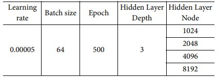 Fully-Connected 모델도 LSTM 모델과 동일한 Optimizer, Loss Function 및 Activation Function을 사용하였다. Learning rate는 널리 사용하는 값 중 하나인 0.00005를, Batch size는 해당 모델에서 하드웨어 성능을 고려하여 64로 설정해 주었으며 충분한 학습을 위해 Epoch 값은 500을 사용하였다. Hidden Layer Depth는 2-5 사이 값 중 하나인 3을 사용하였으며 Node 수를 1024 부터 2배씩 증가시키며 성능 및 학습 시간을 비교하였다. Fully-Connected 모델에서 사용한 Optimizer, Function 및 Hyper Parameter 정보는 Table 5, 6 과 같다.