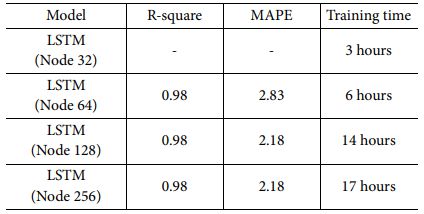 Hyper parameter는 Learning rate, Batch size, Epoch, Hidden Layer Depth, Hidden Layer Node 총 5종류를 사용하였다. Learning rate는 LSTM에서 일반적으로 많이 사용하는 값 중 하나인 0.0001을 사용하였다. Batch size는 한번에 처리할 수 있는 Data의 량으로 Batch size가 크면 빠르게 학습을 수행할 수 있으나 하드웨어 성능에 따라 그 최대 Batch 값이 제한된다. LSTM 모델에서는 하드웨어의 성능을 고려하여 37을 사용하였다. Epoch는 학습을 수행하는 횟수로, 학습이 충분히 이루어지도록 300으로 설정을 하였다. Hyper Parameter 중 성능에 주요하게 영향을 미치는 것은 Hidden Layer Depth와 Node수이다. Depth가 깊고 Node수가 클수록 좋은 성능을 보여줄 가능성이 크나 필요 이상으로 연산시간이 소요되는 문제가 발생할 수 있다. 단일 Depth를 이용하는 경우 보다 복수의 층을 사용하는 경우 Generalization Error 문제 해결에 유리하지만, 너무 많은 층을 이용하며 Vanishing Gradient 문제가 발생하므로 일반적으로 2-5 사이의 Depth를 사용한다[18]. 본 논문에서는 Depth 값으로 4를 사용하였다. Node 수는 성능과 밀접하게 관련이 있으므로 32부터 256까지 2배씩 증가시키며 각 Node별 학습 성능 및 소요 시간을 비교하였다. 학습 정확도에 사용한 지표는 2.2장과 동일하게 R-square 값과 MAPE 값을 사용하였다.