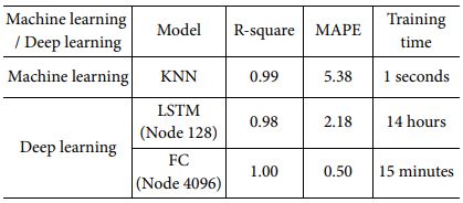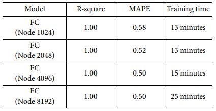 Table 9는 Fully-Connected 모델의 Node별 정확도 및 학습시간을 보여준다. 학습시간이 Node수가 가장 큰 8192 경우에도 25분으로 수초 수준인 머신러닝 모델들 보다는 느리지만 최대 17시간이 걸리는 LSTM 모델에 비하면 매우 빠르고 R-square 값과 MAPE 값도 최고 성능 모델 기준 각각 1.00, 0.50으로 머신러닝이나 LSTM 모델과 비교할 때 성능이 가장 우수한 것을 확인하였다. Node수 8192에서는 증가한 학습시간 대비 성능개선이 이루어지지 않아 Node수가 4096일 때가 최적임을 확인하였다.