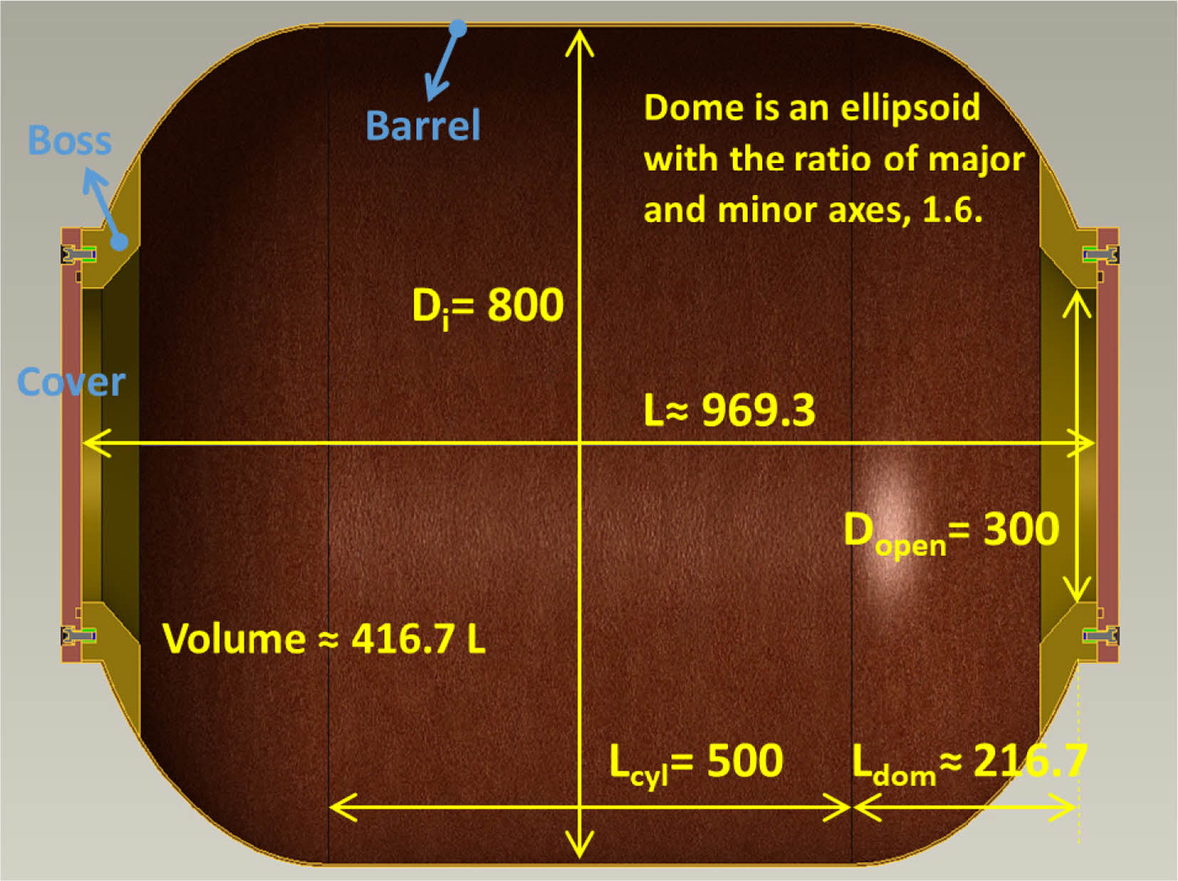 축소형 시제의 전체적인 형상은 다음과 같다. 직경은 800 mm이며 배럴의 실린더부 길이는 500 mm이다. 보스까지 포함한 전체 길이는 약 970 mm이다. 내부의 분리형 맨드릴 조각들을 탈거하기 위해 작업자의 상반신 일부가 들어갈 수 있도록 개구부 직경을 300 mm로 정하였다. 돔부는 타원형으로 최대 내용적과 구조안전성을 동시에 만족하도록 타원 형상의 장단축비를 1.6:1로 결정하였다[12].