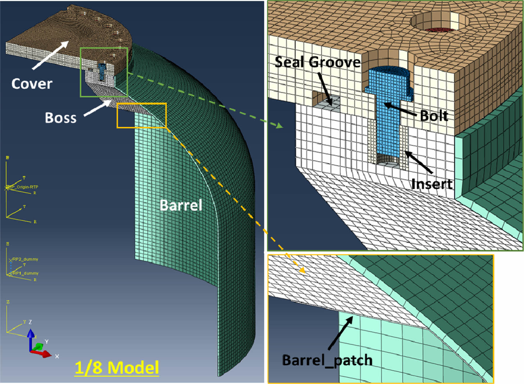 우선 실린더 압력구조물의 원주 방향 변형률과 내압 사이의 관계식을 이용하여, 변형률이 5,000 με 수준이 되도록 복합재층 두께의 초기값을 대략적으로 구한 뒤, 유한요소 해석을 통해 변형률과 파단 지수(failure index)가 최소가 되도록 적층 배열을 선정하였다. 적층 각도는 45°와 90°만 적용하였고, 45°와 90° 비율에 따른 주요 변형률과 응력, 그리고 파단 지수를 비교하여 그 비율을 5:9로 결정하였다. 최종 선정된 설계에 대하여 전체 형상의 1/8 모델에 대칭 조건을 부여하여 유한요소 모델링을 하였다. 양방향 물성이 유사한 평직 직물을 사용하였고 적층 각도를 45°와 90°만 적용하였으므로 대칭 조건은 충분히 타당하다고 할 수 있다. 배럴은 4절점 쉘 요소(S4R)를 적용하였고, 덮개와 보스는 두께를 고려하여 연속체 쉘 요소(SC8R)를 적용하였다. 볼트와 인서트는 8-절점 선형 육면체 요소(C3D8R)를 적용하였다.