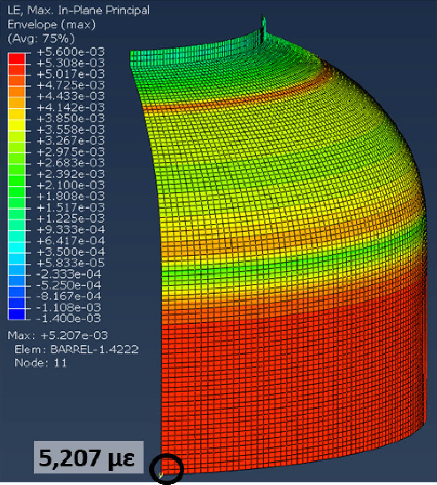 다음은 MEOP의 1.25배를 가한 경우 변형률과 파단 지수의 분포를 나타내고 있다. 최대 면내 변형률은 실린더 중앙부에서 5,207 με이고, 이를 보증압 기준으로 환산하면 4,374 με으로 기준을 만족한다.