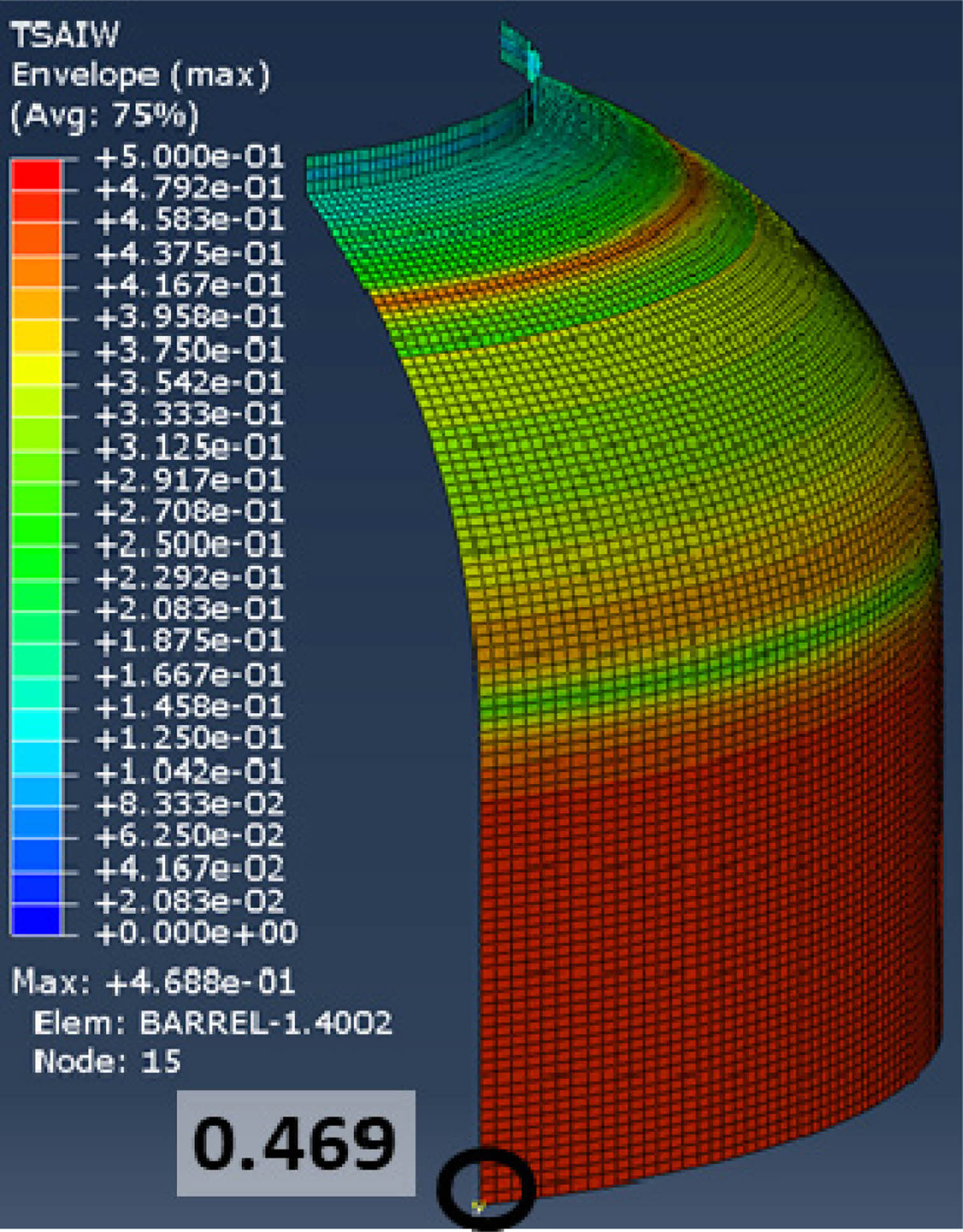 모든 파단 지수가 기준을 만족하였고, 가장 큰 값을 보인 것은 Tsai-Wu 지수로 약 0.47이다. 응력을 성분별로 분석한 결과 파단 모드는 예상대로 ‘원주 방향 인장’인 것으로 확인되었다.