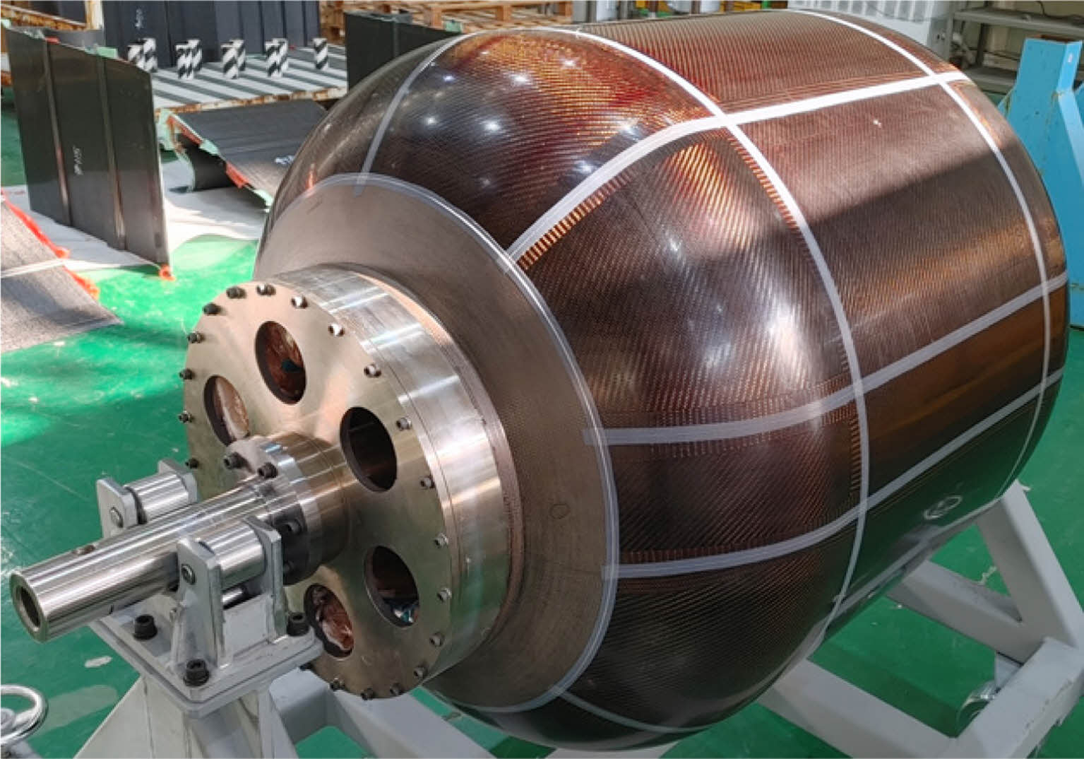 복합재 분리형 맨드릴과 보스 조합체 상에 탄소섬유 강화 복합재 프리프레그를 핸드레이업 공정으로 적층한 후 오토클레이브 경화를 거쳐 탱크를 제작하는 제작공정을 수립하였다. 이러한 제작공정을 이용해 직경 800 mm의 축소형 시제품을 제작한 후 상온 보증압 시험, 헬륨 가스를 이용한 덮개 기밀 시험, 반복 가압 시험, 그리고 파열 시험을 수행하였다. 시험 결과 보증압 상태 및 40회 반복 가압 상태에서 유해한 변형은 발견되지 않았으며, 덮개부의 기밀 성능에도 전혀 문제가 없음을 확인하였다. 또한 파열시험 결과 3.43 MPa에서 파열되었고 파열에 대하여 0.61의 안전여유가 있음을 확인하였다.