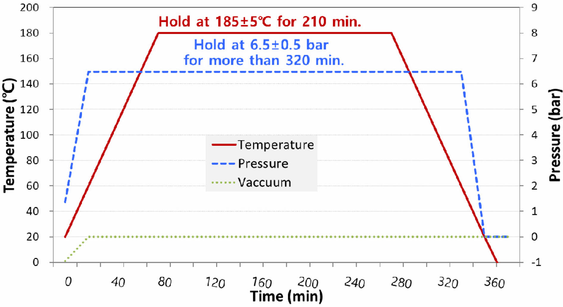 오토클레이브 경화 사이클은 다음 그림과 같다. 경화 중 온도 측정을 위해 2개의 열전대를 부착하였고, 온도가 늦게 상승하는 지점의 열전대를 기준으로 경화 온도를 조절하였다. 경화가 완료되면 배깅 필름을 제거한 후 맨드릴 조각들을 순차적으로 분해 및 탈거하였다.