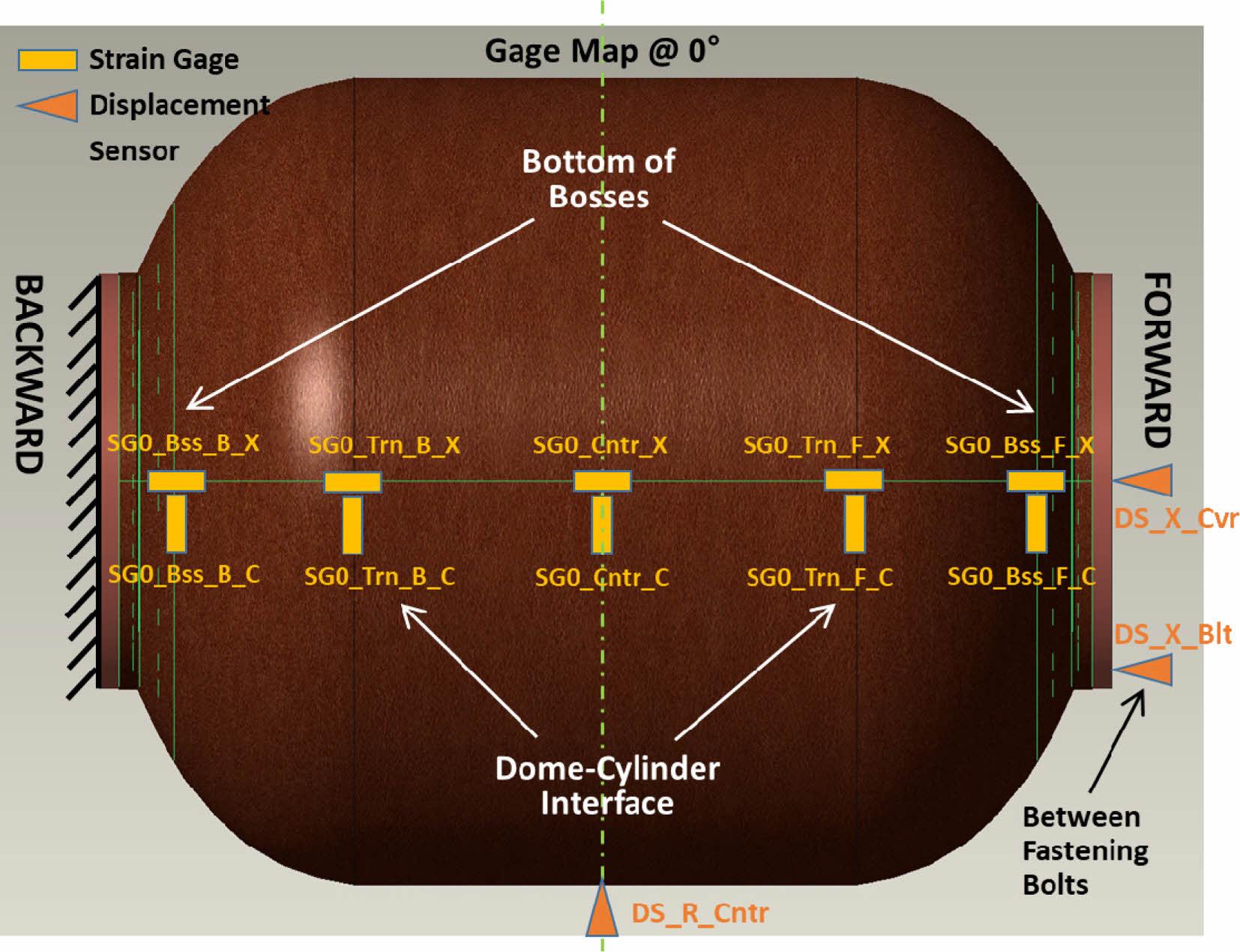 각 시험에서 압력, 변형률, 그리고 변위를 계측하였다. 변형률은 8개 지점에서 원주 방향과 축 방향으로 각각 측정하였으며, 본 논문에서는 편의상 돔 부위의 자오선 방향을 축 방향으로 명명하였다. 변위는 실린더 중앙부 반경 방향 변위, 상부 덮개 가운데 축 방향 변위, 그리고 상부 덮개 볼트 체결부 사이 축 방향 변위를 측정하였다. 다음 그림은 0° 방향에 부착한 변형률 게이지와 변위 센서 위치이다. 90°, 180°, 270° 방향에는 실린더 가운데 부위에만 변형률 게이지를 부착하였다.