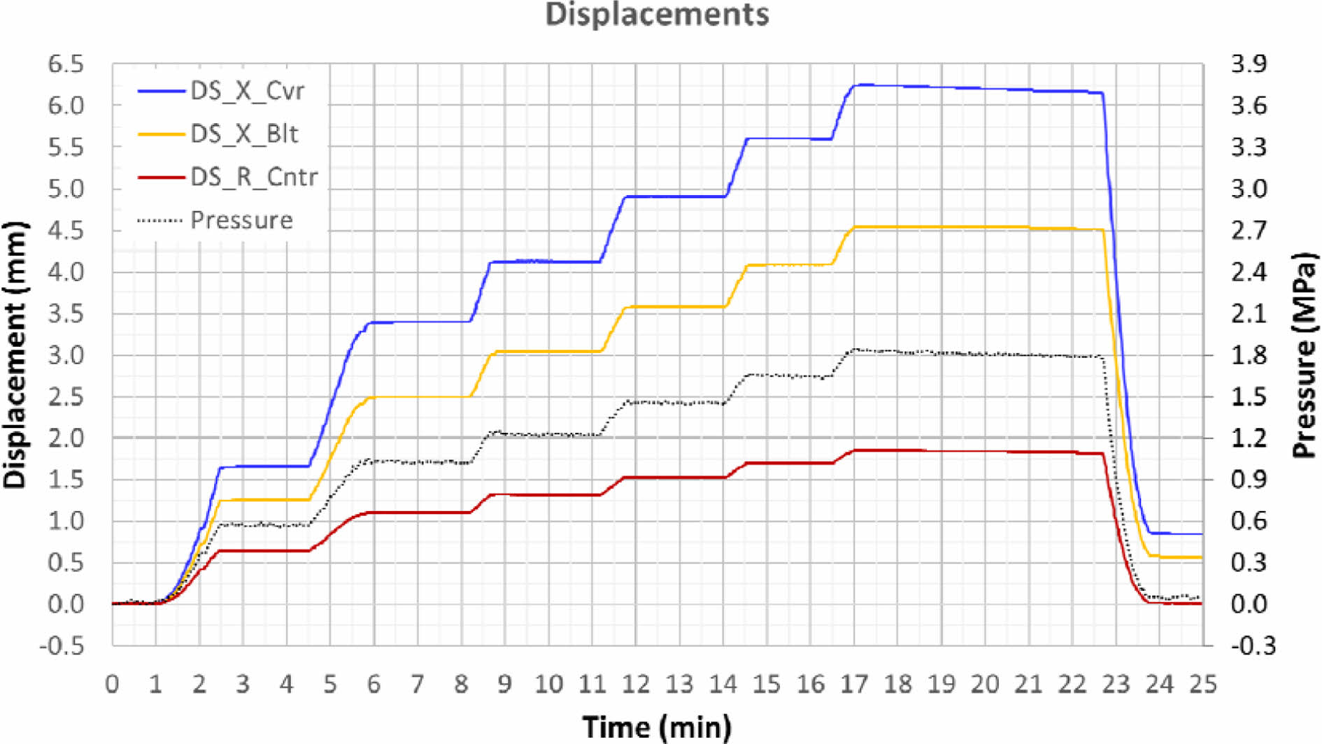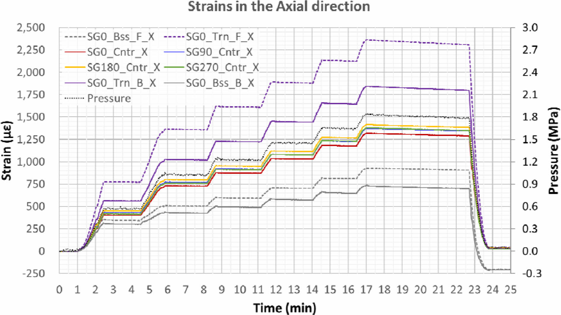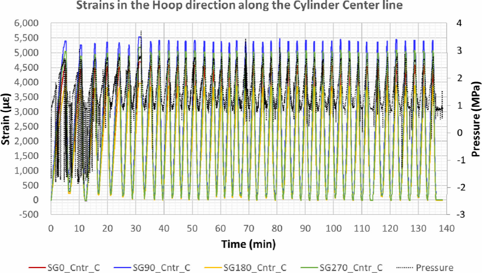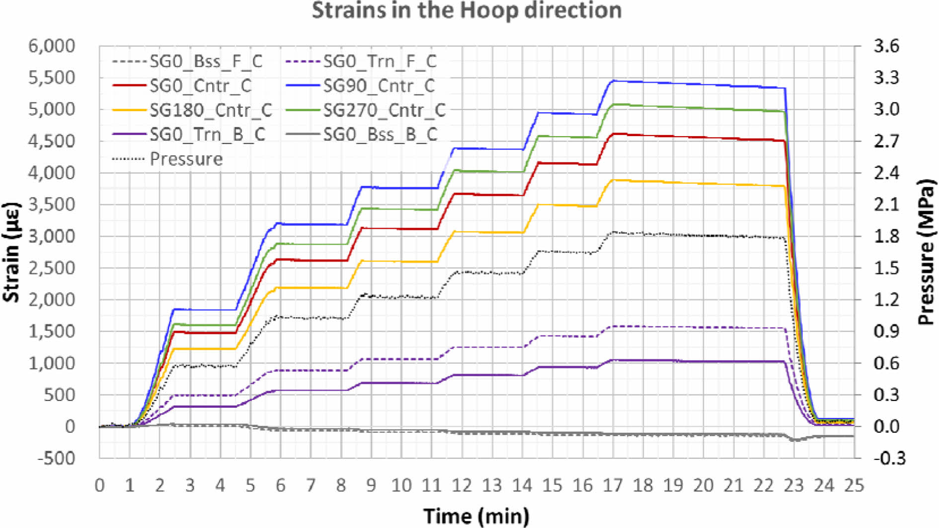 상온 보증압 시험에서 압력은 1.85 MPa까지 가압하였고, 90° 간격으로 측정된 실린더 중앙부에서의 원주 방향 변형률은 각각 4613, 5452, 3887, 5079 με으로 측정되었고 평균은 약 4758 με이다. 이를 보증압 기준으로 변환하면 유한요소 해석 결과 대비 약 106% 수준이다. 보스 끝단부의 원주 방향 변형률은 실린더 중앙부의 변형률에 비해 5% 수준으로 매우 작긴 하지만 압축 방향으로 발생하는 것이 특징적이다. 축 방향 변형률은 원주 방향 변형률에 비해 작으며 상부 돔/실린더 경계 구간에서 최대 변형률 2,365 με이 측정되었고 해석 결과 대비 108% 수준이다. 실린더 중앙부의 반경 방향 변위와 상부 덮개 가운데 축 방향 변위는 각각 최대 1.85 mm, 6.25 mm이며 해석 결과 대비 약 103% 수준이다.