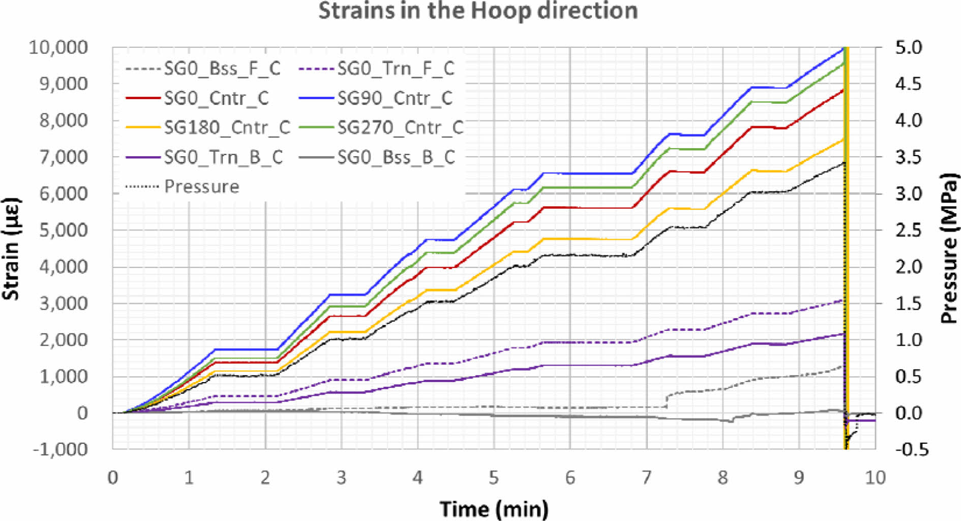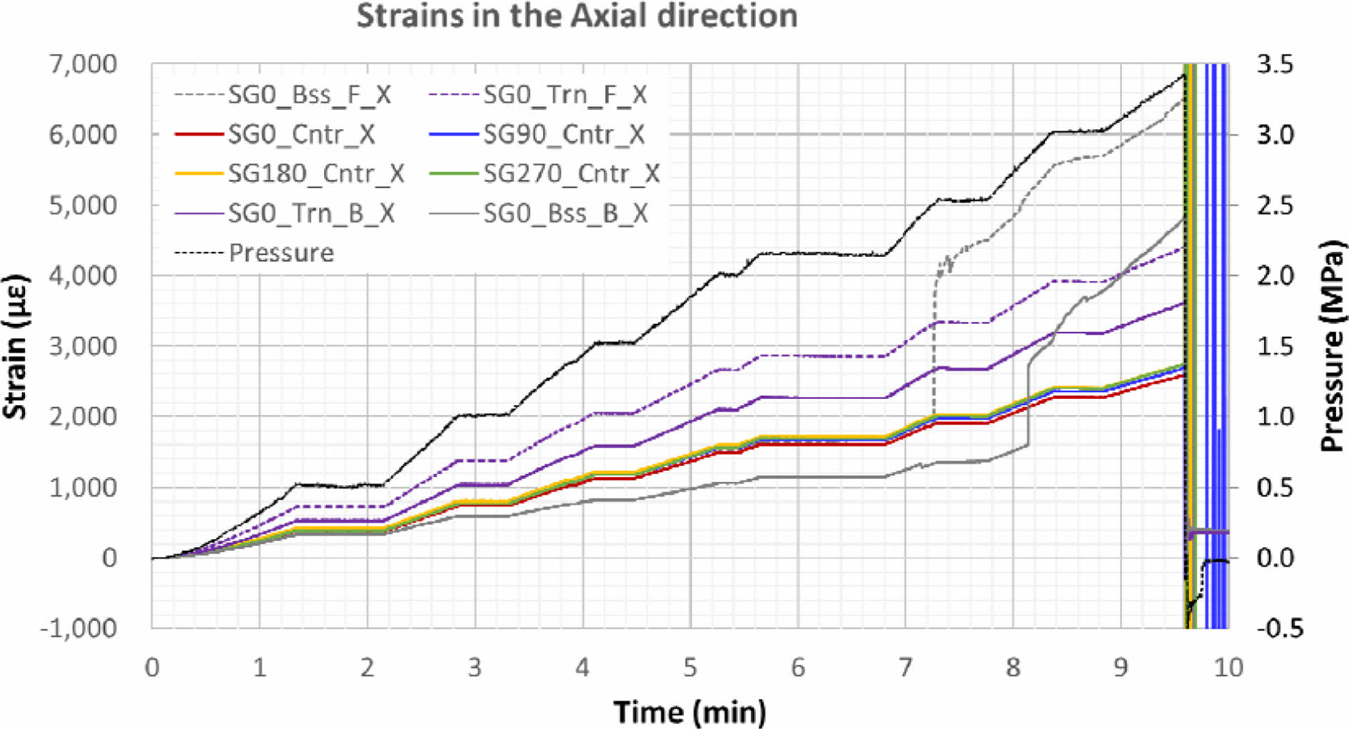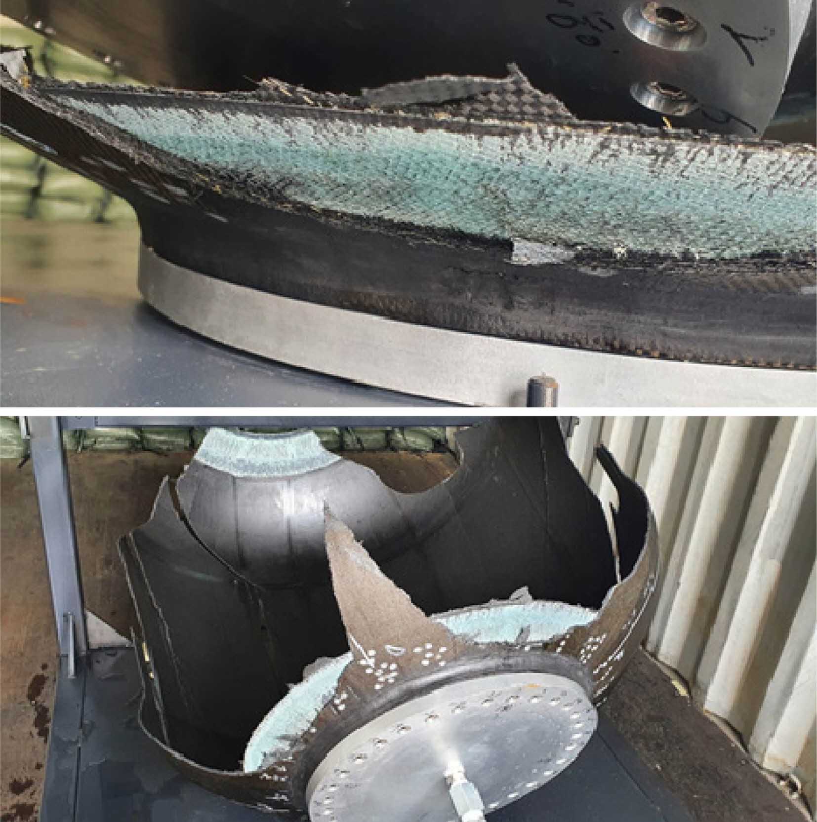 시제품은 3.43 MPa에서 파열되었고 0.61의 안전여유가 있음을 확인하였다. 파열 시점에서의 최대 변형률은 90° 실린더 중앙부의 원주방향 변형률로 9,945 με이었다. 축 방향 변형률을 살펴보면 상/하부 보스 끝단부(보스와 배럴 접합부의 시작 지점)의 변형률이 2.51 MPa과 2.84 MPa에서 급격하게 증가하는 것을 확인할 수 있다. 이는 이 시점에 보스-배럴 접착부의 일부 영역이 디본딩된(debonded) 영향으로 판단된다. 다만, 이러한 일부 디본딩에도 불구하고 해당 부위에 보강 적층된 플라이와 보스-배럴 접착부의 접착 강도로 인해 파열 전까지 내압을 견딘 것으로 판단된다.