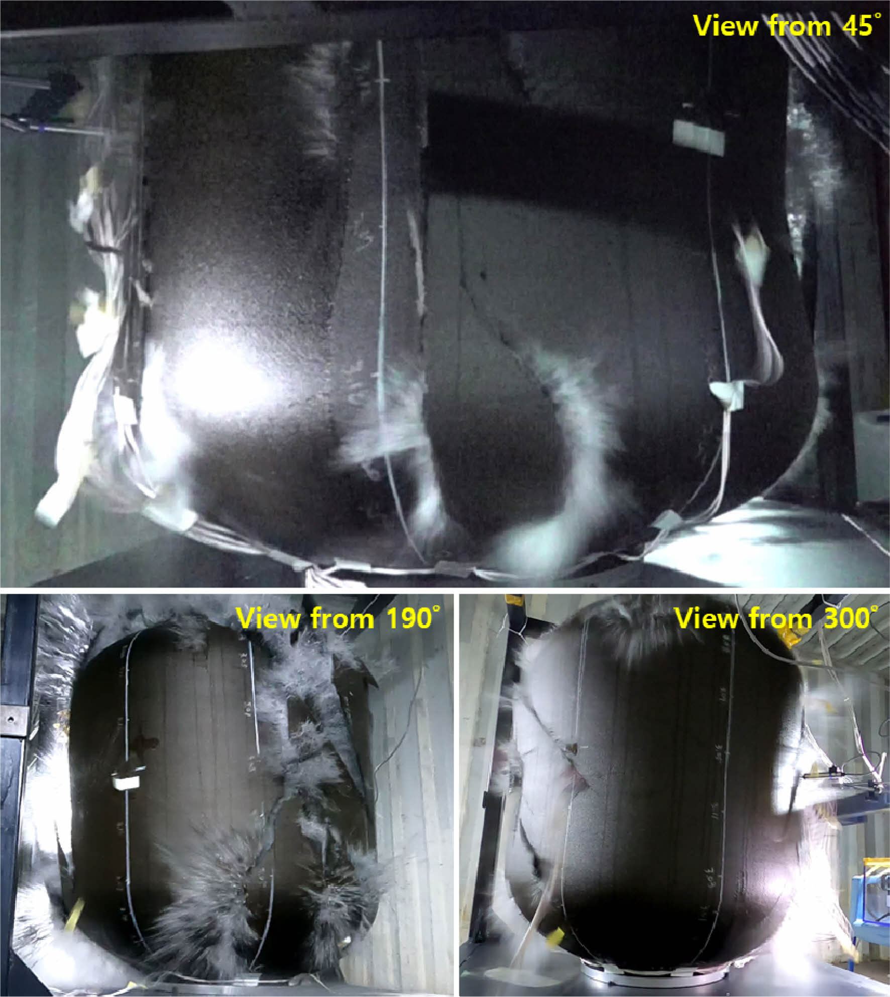 고속 촬영 영상을 확인한 결과, 파열 전 보스와 배럴 접착부가 파손된 후 그 사이로 물이 스며들면서 돔-실린더 경계부의 과도한 변형으로 이어져 이 부위에서 균열이 시작된 후 전체 파열로 이어진 것으로 판단된다. 따라서, 보스-배럴 접착부를 추가 보강한다면 파열강도를 향상시킬 수 있을 것으로 기대된다.