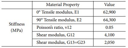 축소형 시제의 제작을 위해 177oC 경화 탄소섬유 직물 프리프레그를 이용하였고 주요 강성 정보는 다음과 같다.