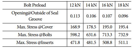 덮개를 조립하기 위한 볼트 체결력을 선정하기 위하여, 볼트 체결력을 변경시키면서 씰 그루브 바깥면의 틈새와 덮개와 볼트 및 인서트의 응력을 비교한 결과, 틈새 기준을 만족하는 조건 중에서 응력을 최소화하도록 체결력을 14 kN으로 선정하였다.