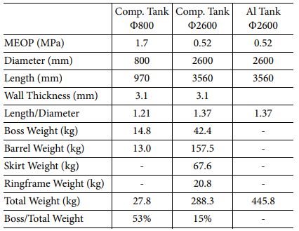 실린더부 복합재 층 두께는 평균적으로 약 3.0 mm 로 측정되었다. 상/하부 보스의 무게는 14.8 kg, 배럴 무게는 13.0 kg로, 보스가 전체 중량에서 차지하는 비율이 50% 이상이다. 하지만, 복합재 탱크의 직경이나 길이대 직경비를 누리호 2단 형상에 맞춰 예비 설계를 해보면, 다음과 같이 보스의 비중을 15%까지 줄일 수 있고 이로 인해 금속재 탱크 대비 약 35%의 경량화가 가능할 것으로 예상된다. 또한 현재 보스 형상 중 필요없는 영역을 제거하는 등 최적화를 수행한다면 추가적인 경량화가 가능할 것으로 판단된다.
