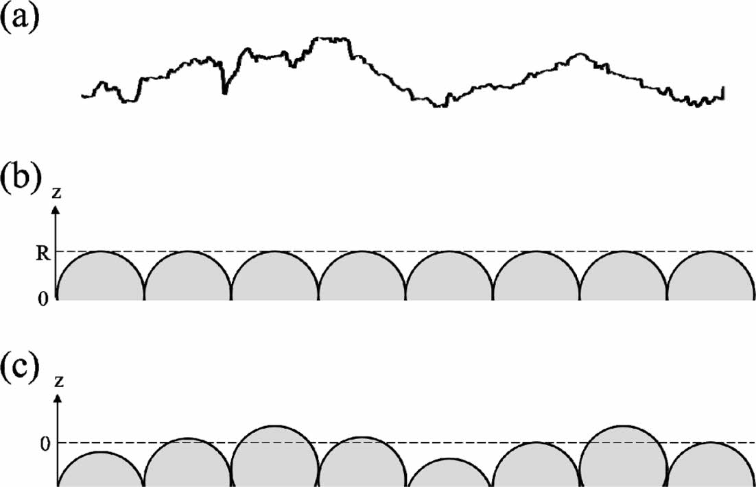 Fig. 1 Schematic representation of (a) a rough surface, (b) the Hertz model, and (c) the Greenwood-Williamson model |